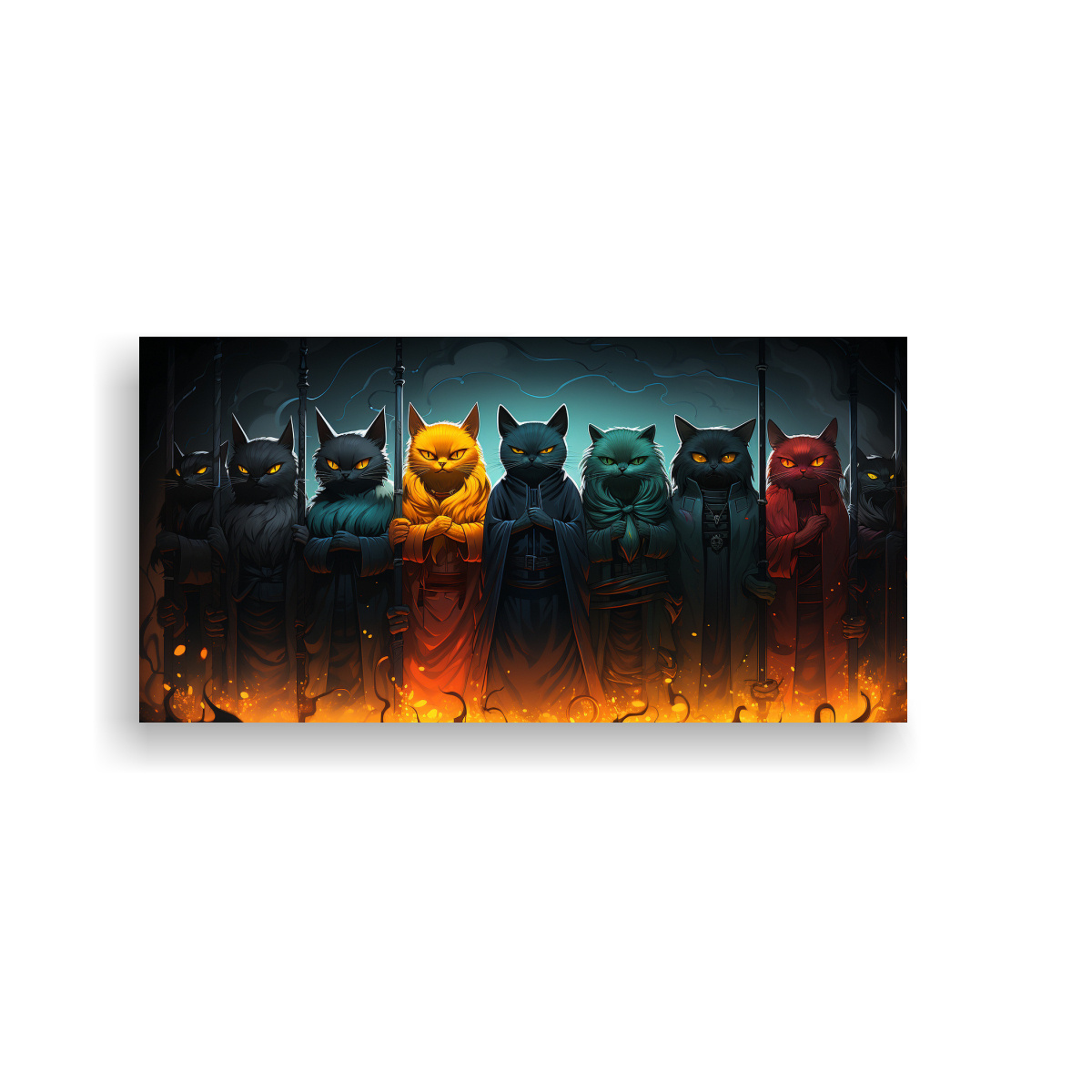 Este cuadro ‘Arte Movimiento Relieve homestuck cats’ en tonos mostaza, negro y plateado sería ideal para colocar en la sala de estar sobre un mueble de madera clara, creando un contraste elegante y moderno Complementa con cojines en colores turquesa o amarillo claro para resaltar la vibrante paleta de colores del cuadro