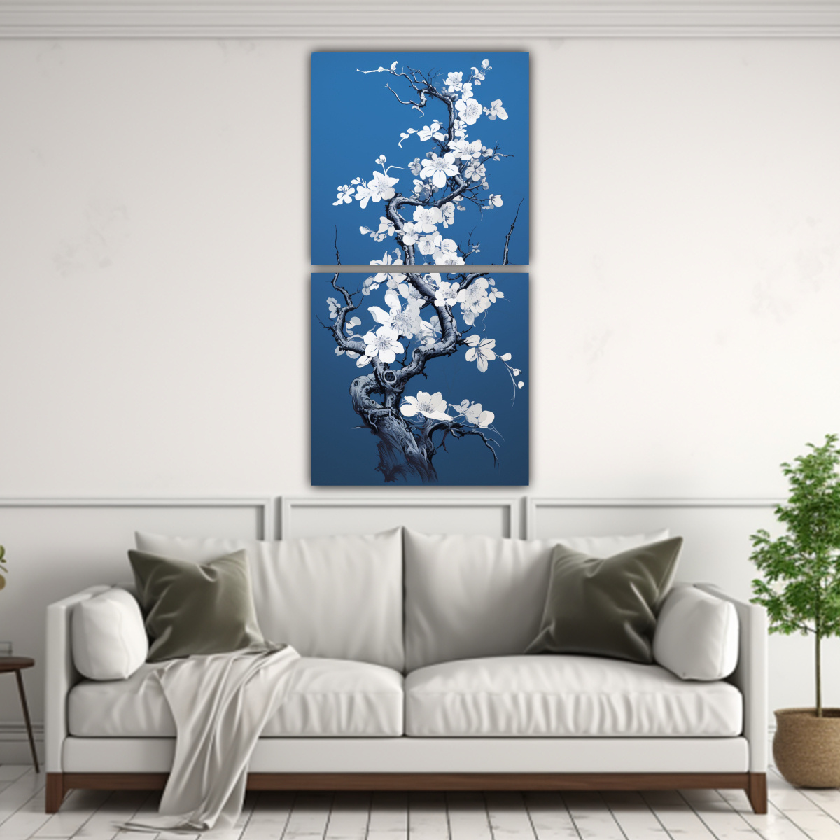 Este cuadro sería perfecto para decorar un salón con un estilo minimalista y moderno Puedes colocarlo sobre un sofá en tonos blancos y grises, y complementar con cojines y cortinas en los mismos colores El contraste entre el árbol de durazno en tonos azules y blancos y la paleta de colores neutros de la habitación creará un ambiente sofisticado y elegante