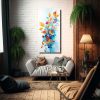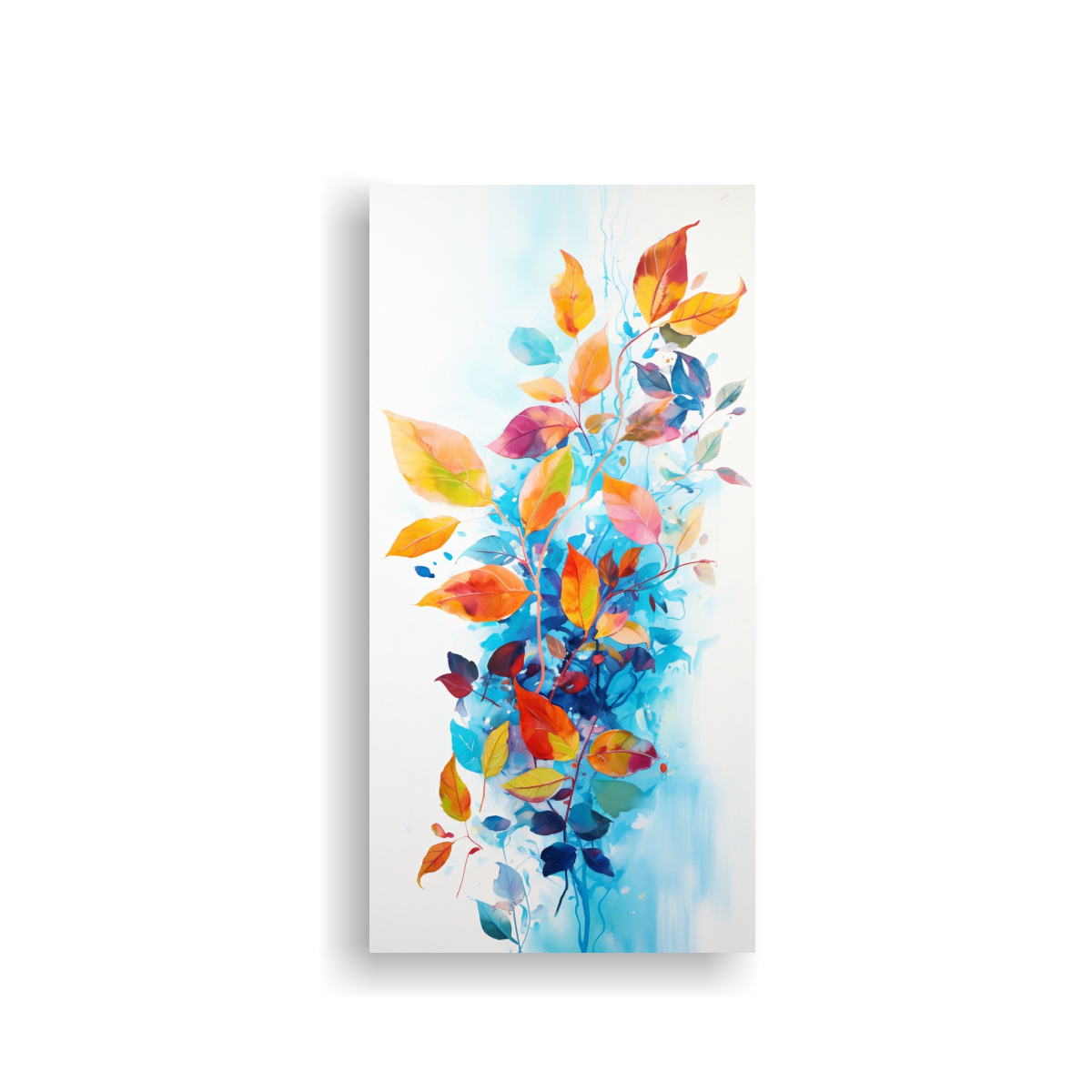 Combina este cuadro de hojas coloridas con salpicaduras en tonos coral, turquesa, beige, plateado, azul marino grisaceo, rosado claro, gris y lila, con una pared en tono neutro para darle protagonismo También puedes colocarlo en un ambiente en tonos pastel para crear un contraste armonioso