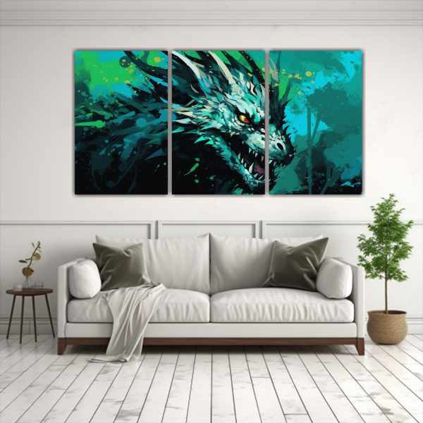 Este cuadro es ideal para colocarlo en la sala de estar sobre un sofá de color neutro para resaltar su impacto visual Combínalo con cojines en tonos plateados y verdes para crear un ambiente sofisticado y moderno ¡Atrévete a añadir un toque de misterio con este cuadro de dragón en verde y turquesa!