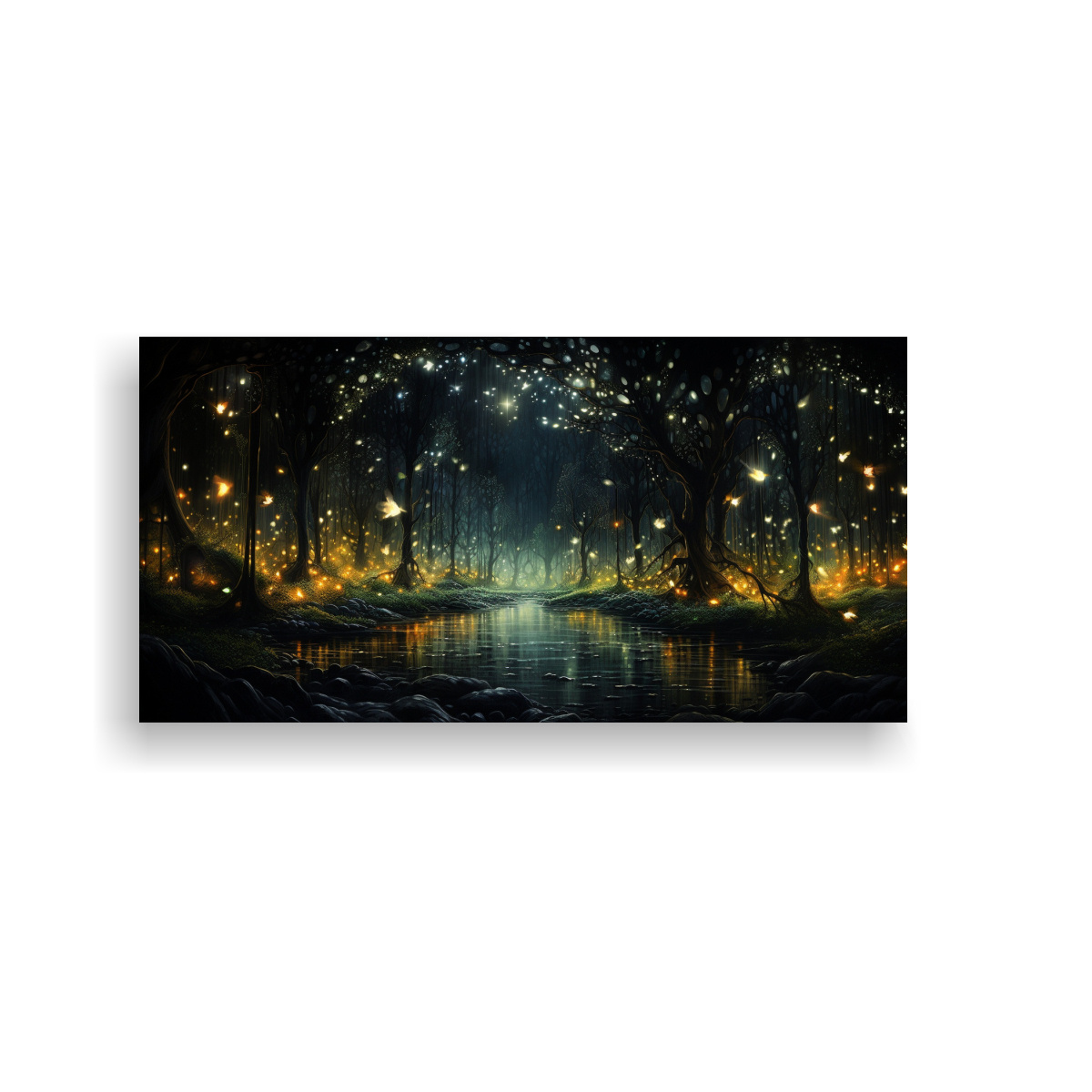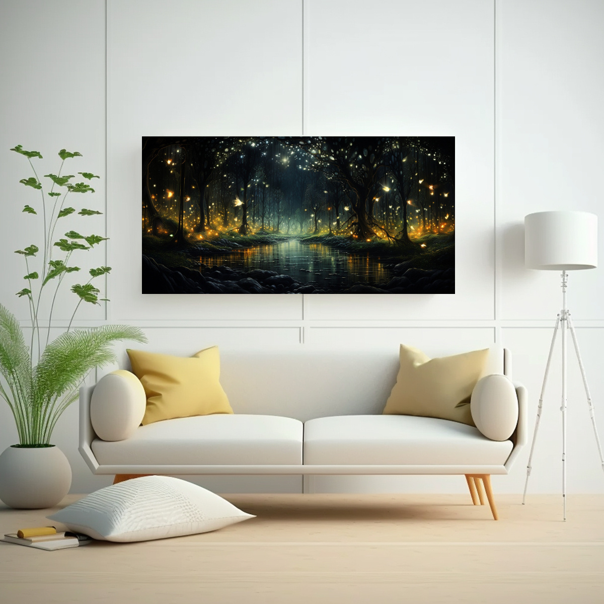 Coloca este cuadro en tu sala de estar para crear un ambiente mágico y relajante Combínalo con muebles en tonos dorados y beige para resaltar su belleza También puedes ubicarlo en tu dormitorio para disfrutar de la serenidad que evocan las luciérnagas en la luna