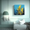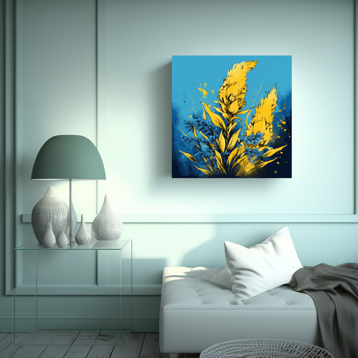 Este cuadro sería perfecto para colocar en la sala de estar, sobre un sofá de tonos neutros Sus colores amarillo y azul resaltarán en contraste con los muebles y las paredes, creando un ambiente moderno y sofisticado Complementa la decoración con cojines y cortinas en tonos dorados y plateados para añadir un toque de elegancia