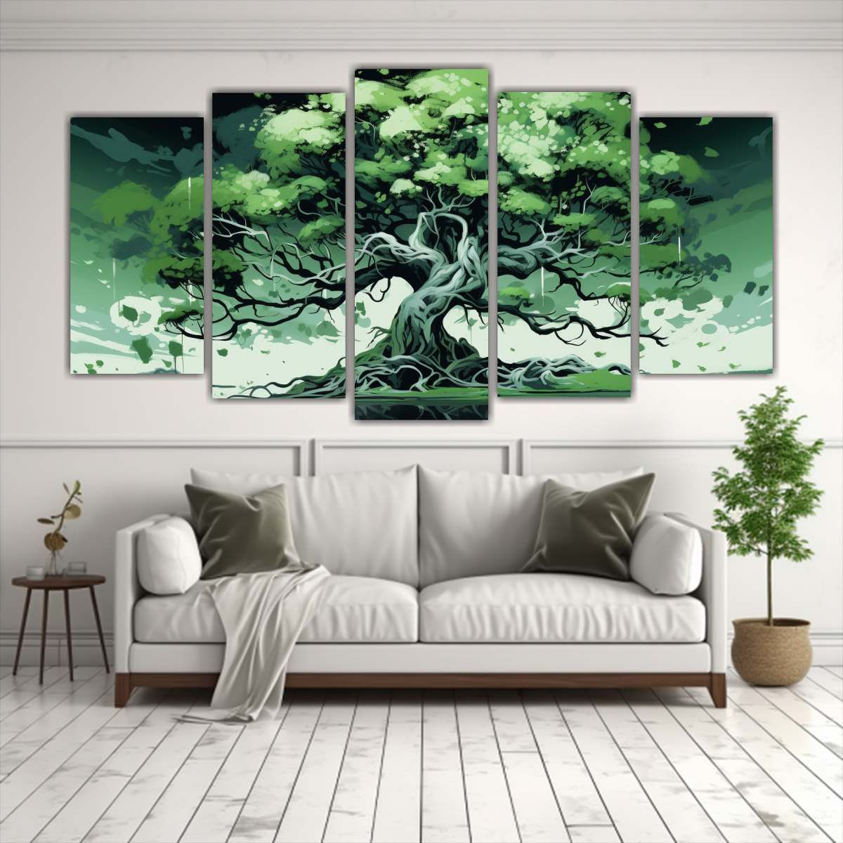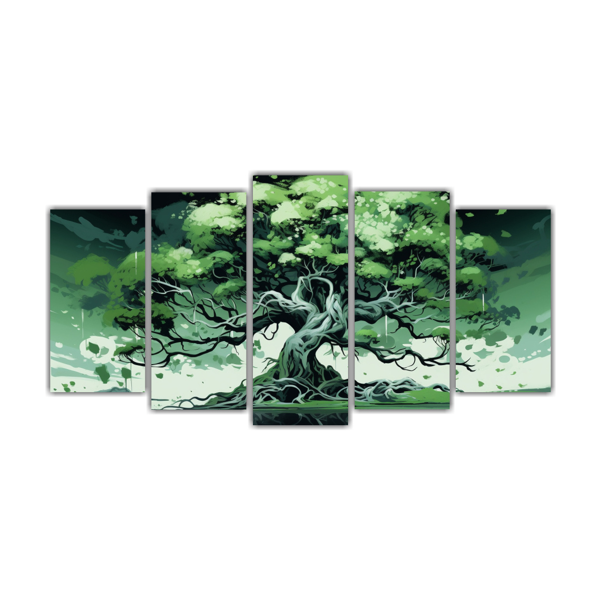 Pinturas Decorativas De Lienzo Cinco Movimiento Llamativo En Un árbol De Banyan En Colores Verde Y Blanco, Ambiente Neonoir