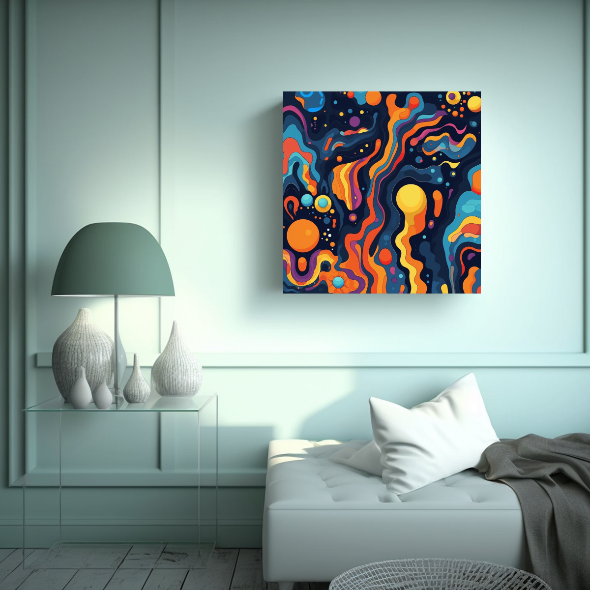 Este cuadro de Pinturas decorativas de lienzo con patrones de fondo psicodélicos y movimiento impactante en colores como Coral, Turquesa, Azul Marino grisaceo, Dorado, Menta, Chocolate y Lila, es perfecto para darle vida y energía a tu sala de estar o dormitorio Su diseño único y vibrante se convertirá en el centro de atención de cualquier espacio Combínalo con muebles en tonos neutros para crear un contraste llamativo, o con colores similares para lograr una armonía cromática ¡Deja que este cuadro sea el protagonista de tu decoración!