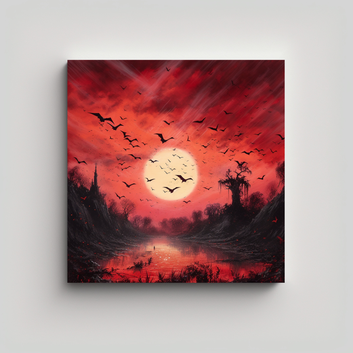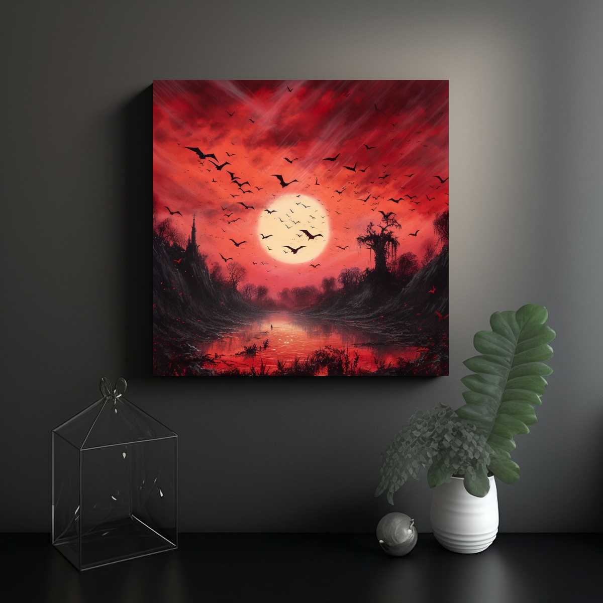 Pinturas Decorativas De Lienzo Rojo Con Murciélagos En El Cielo.