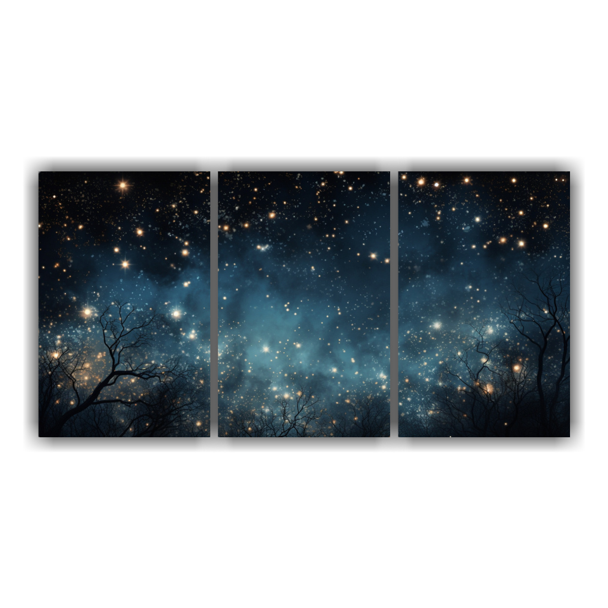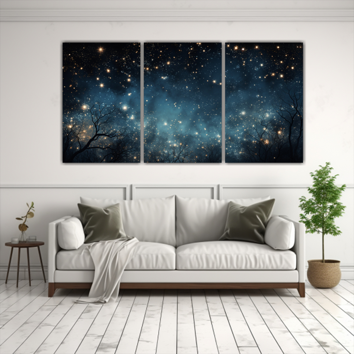 Este cuadro de composición de constelaciones etéreas en tonos de gris, plateado, negro, azul marino grisaceo y dorado quedará espectacular en tu sala de estar Combínalo con muebles modernos en tonos neutros, como blanco y gris, para lograr un ambiente sofisticado y contemporáneo También puedes colocarlo en tu dormitorio para crear una atmosfera relajante y misteriosa ¡Deja volar tu imaginación y dale un toque de elegancia a tus espacios con este cuadro decorativo exclusivo de DecoCuadros!