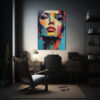 Este cuadro de movimiento para sala con una dama de boceto con mirada profunda y colorido es ideal para decorar una sala de estar moderna Puedes colocarlo sobre un sofá gris para crear un contraste llamativo y agregar un toque de color a la habitación También puedes combinarlo con cojines en tonos similares, como Coral, Azul Marino grisaceo o Turquesa, para lograr una armonía en la decoración ¡Atrévete a darle vida a tu sala con este hermoso cuadro!