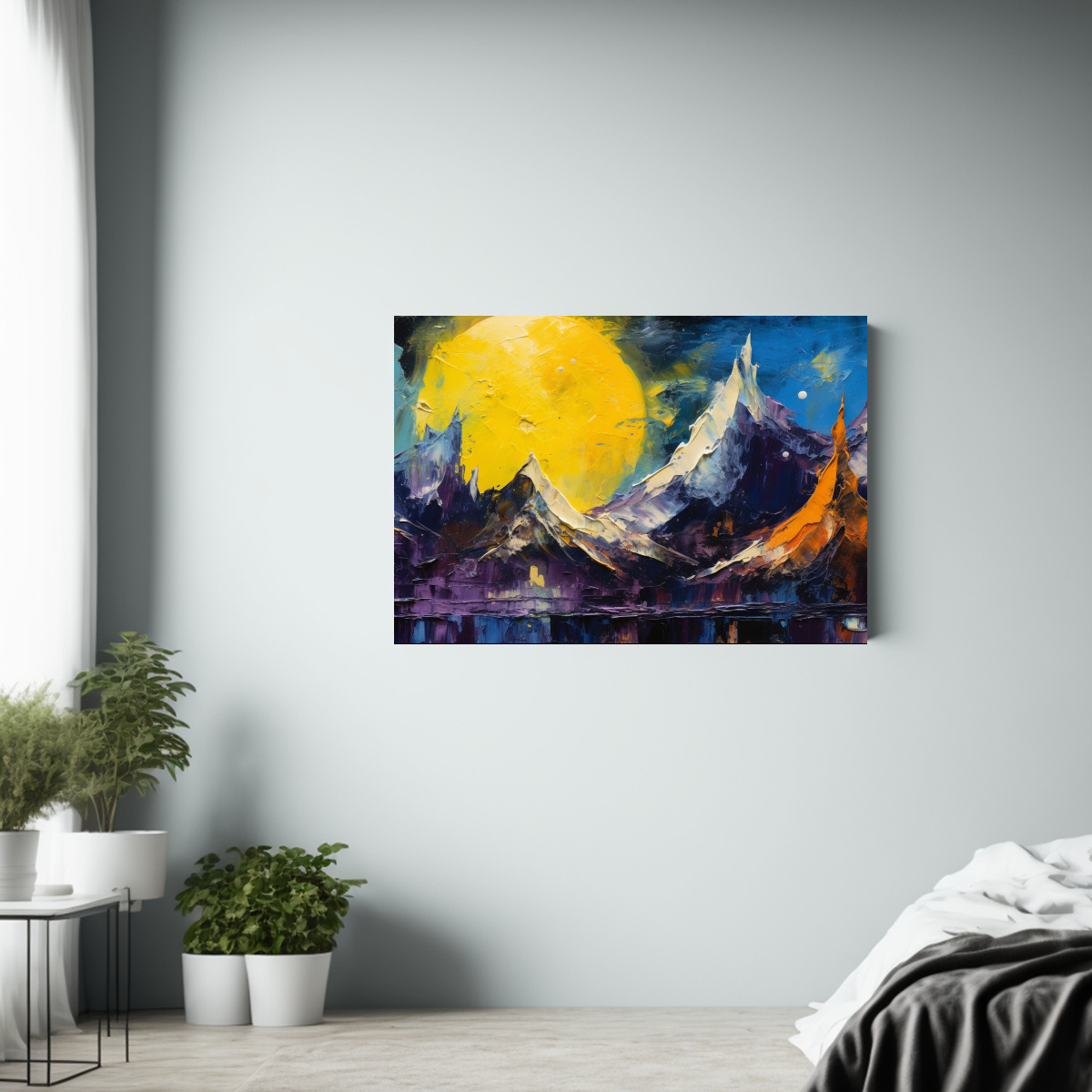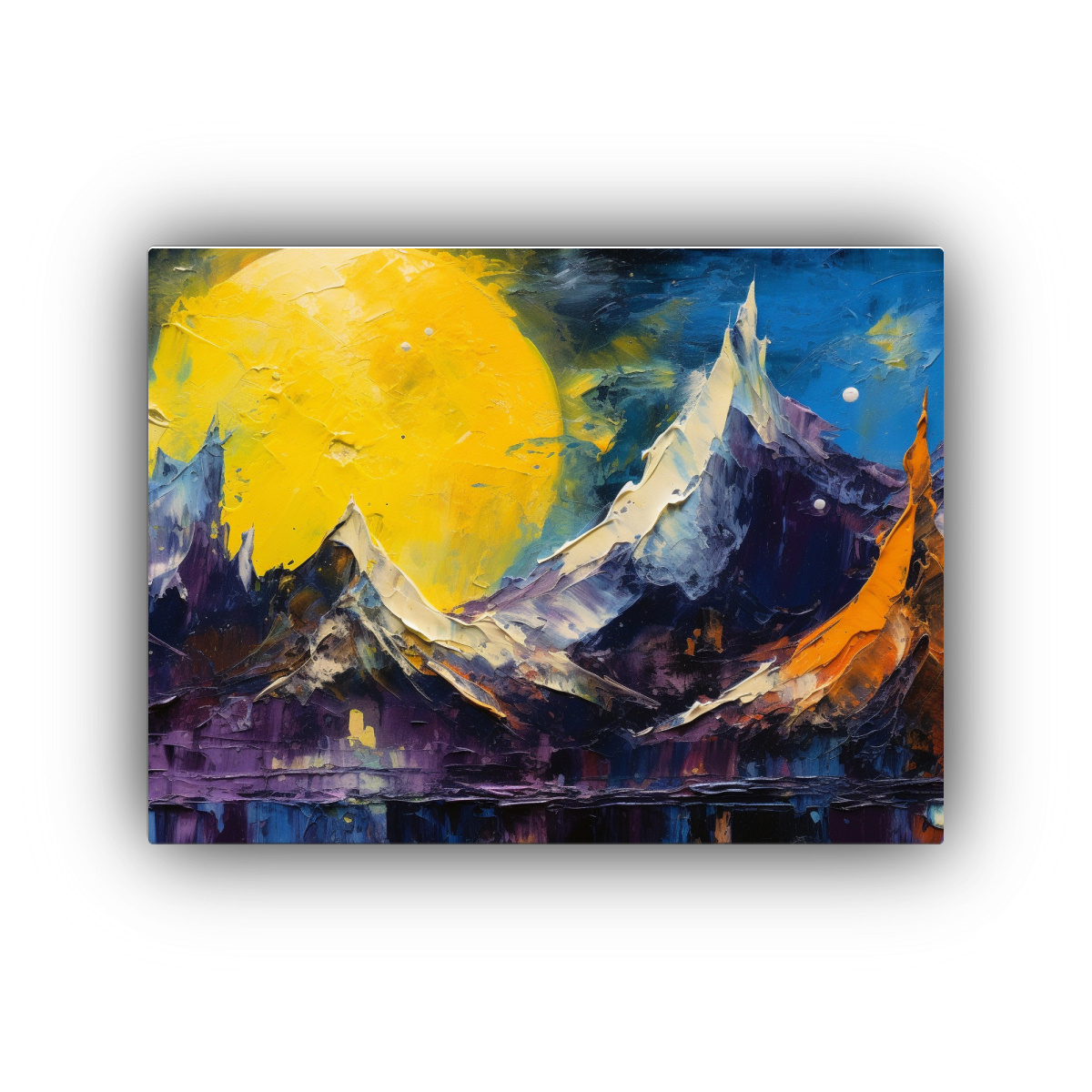 Adorna tus espacios con esta pintura decorativa que refleja la serenidad de la naturaleza en tonos vibrantes Aprovecha nuestras entregas rápidas y gratuitas en Santiago, con envíos express a regiones Encuentra inspiración en la belleza de la Luna amarilla y las montañas para crear un ambiente relajante y sofisticado