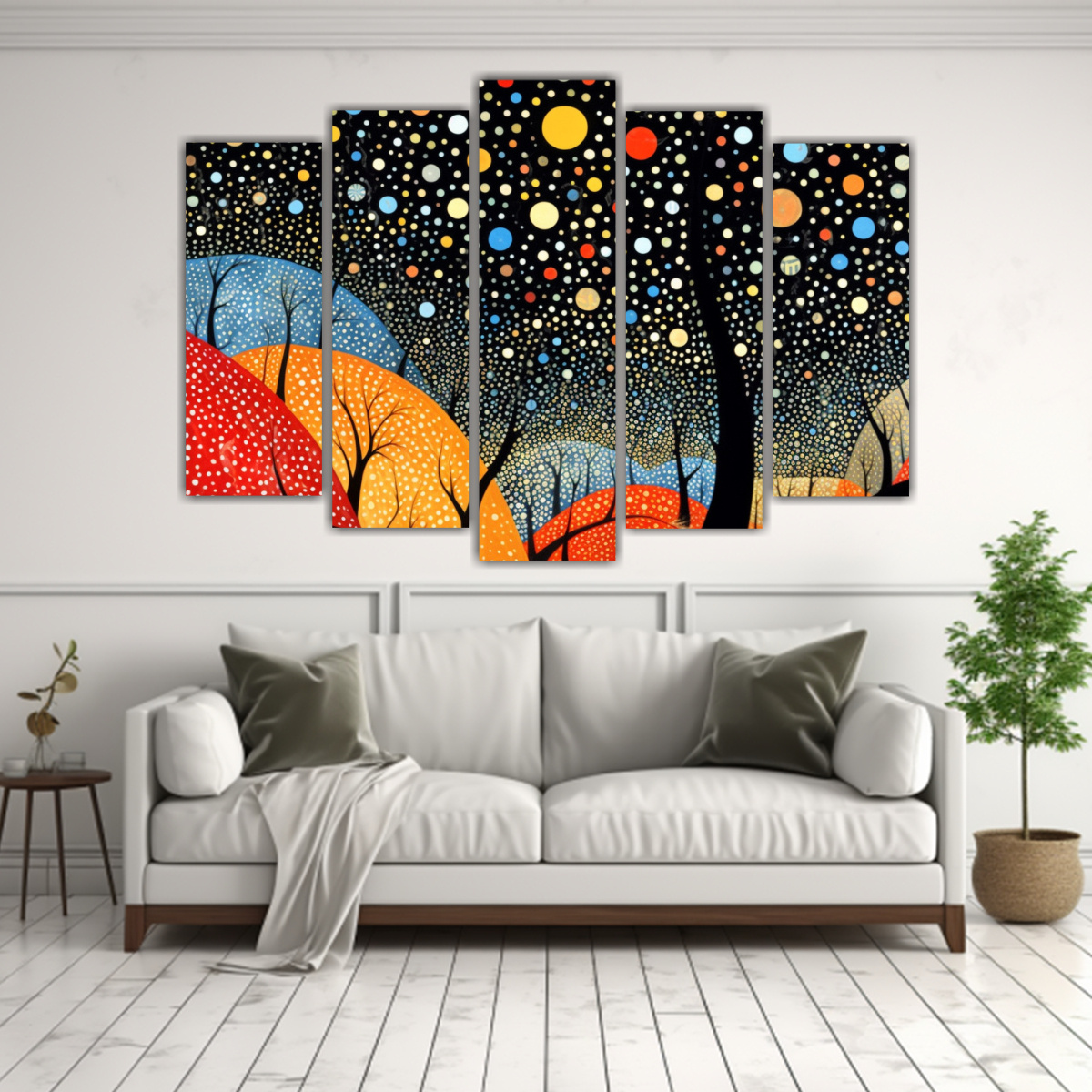 Coloca el Set 5 Telas en Bastidor Calidos estilo Yayoi Kusama en tu sala de estar para darle un toque moderno y vibrante Combina los colores con cojines en tonos neutros para resaltar la belleza de la obra y crear un ambiente equilibrado y sofisticado ¡Dale vida a tus paredes con esta obra de arte única!