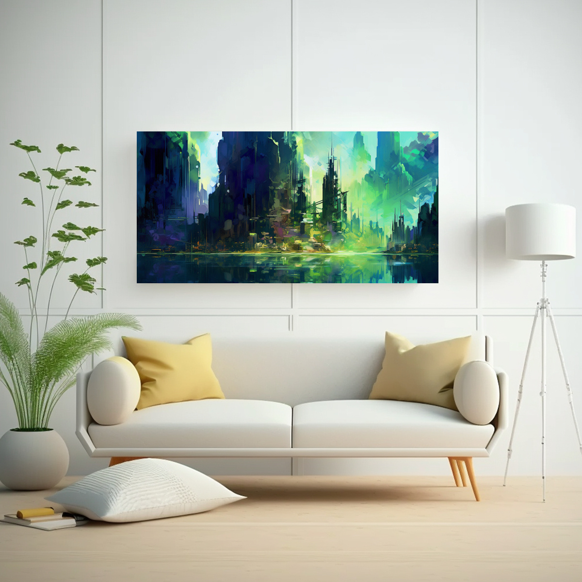 Este cuadro en tonos menta, plateado, azul marino grisáceo, mostaza y chocolate sería perfecto para decorar tu sala de estar o estudio, creando un ambiente moderno y original Combínalo con muebles en tonos neutros para resaltar su belleza alienígena