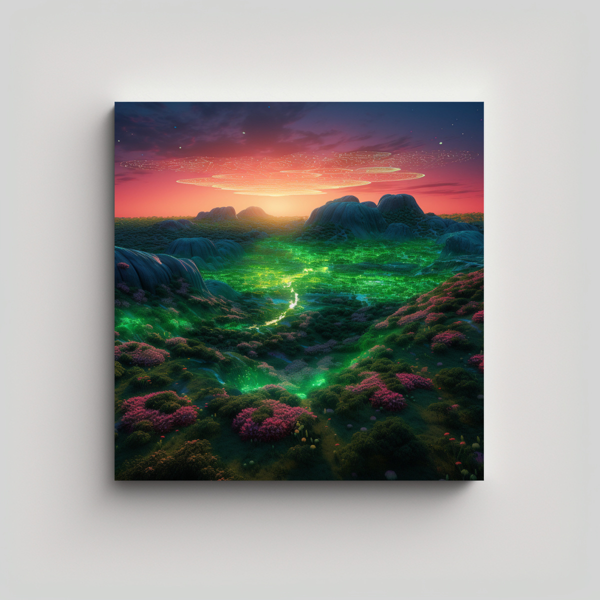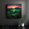 Embellece tus espacios con la tela en bastidor decorativa de hilly mounts roys utopia con verde flora digital en tonos Coral, Azul Marino grisaceo, Menta, Amarillo Claro y Lila Añade un toque de naturaleza y modernidad a tu hogar