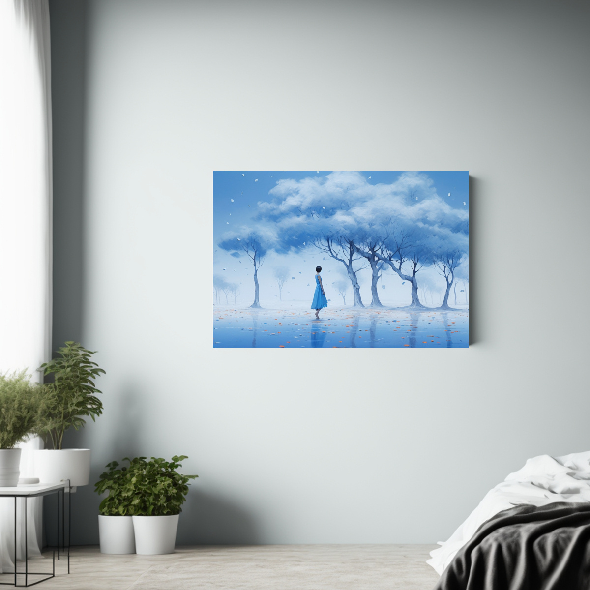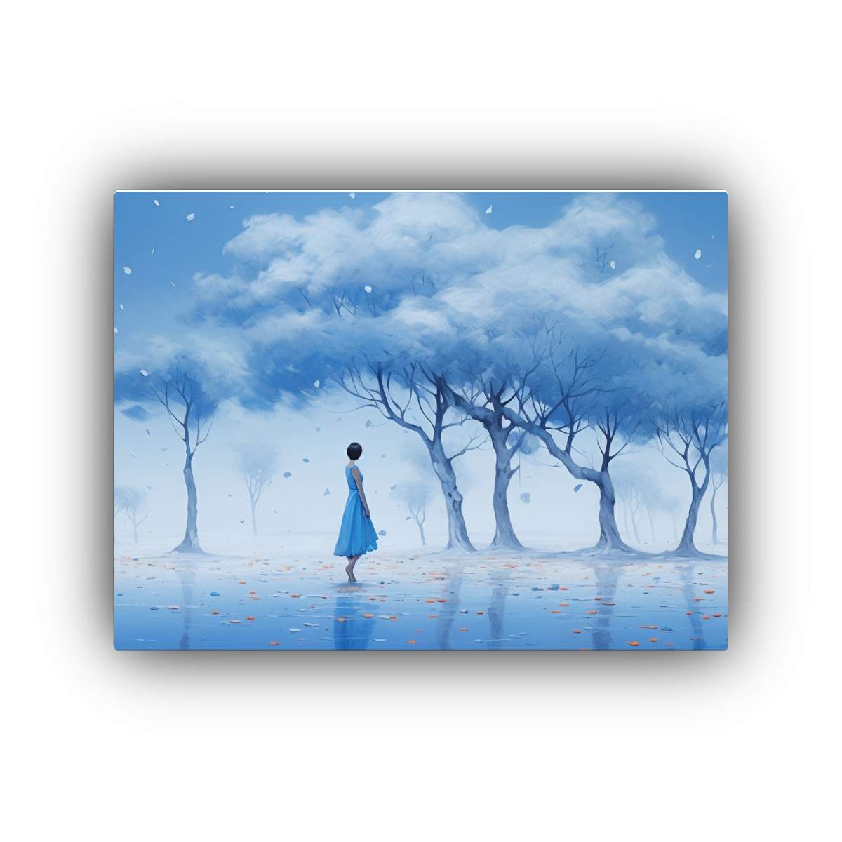 Este cuadro de primavera azul se vería perfecto en la sala de estar sobre un sofá blanco, creando un contraste elegante y refrescante Combínalo con cojines en tonos plateados y verdes para un ambiente armonioso y sofisticado