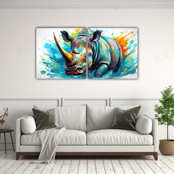 Este cuadro tonos impactantes de rinocerontes en colores vibrantes y turquesa sería ideal para decorar una sala de estar moderna Colócalo sobre un sofá gris para resaltar los colores del cuadro y crear un ambiente vibrante y elegante