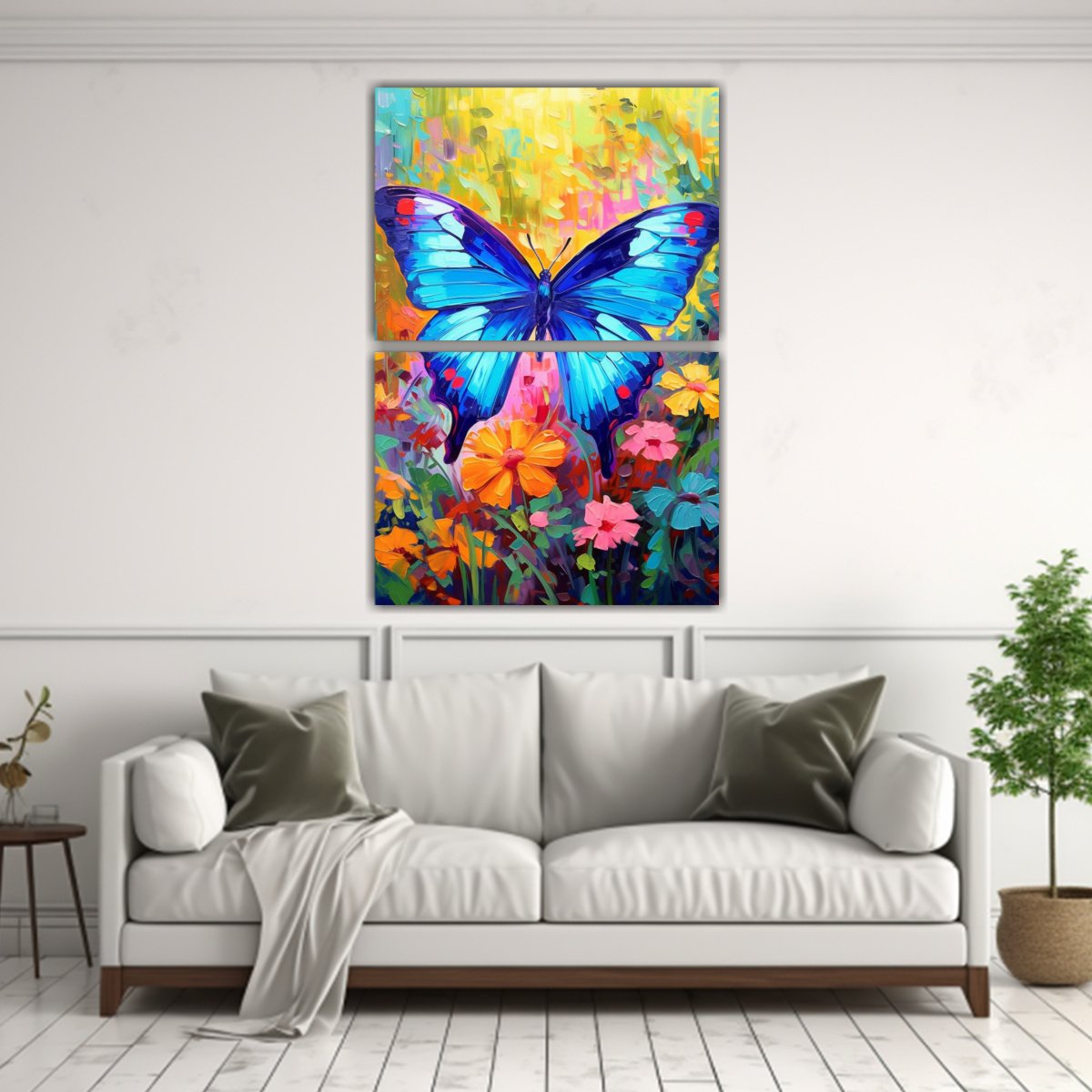 Pinturas Decorativas De Tela Con Tonos Y Textura De Mariposa Azul Morpho A Distancia.