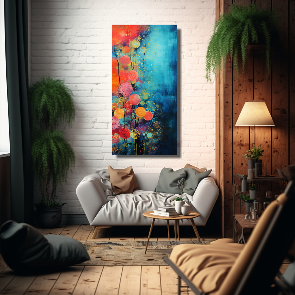 Este cuadro sería perfecto para decorar una sala de estar moderna Puedes colocarlo sobre un sofá de color neutro para resaltar sus colores vibrantes y crear un punto focal en la habitación