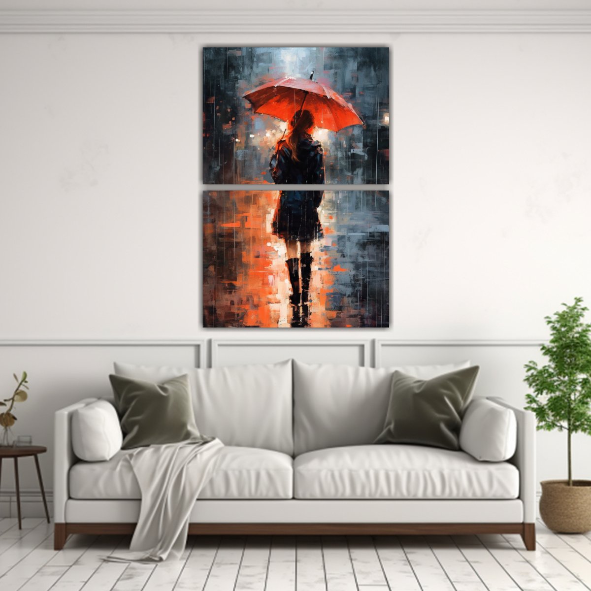 Este Set 2 Telas en Bastidor Tonos clásico Cinematic Abstract Impressionism Emotional Darkness Rainy es perfecto para decorar tu sala de estar o dormitorio Su combinación de colores cálidos como el coral y el carmesí, junto con tonos neutros como el azul marino grisaceo, el gris y el plateado, crea un ambiente elegante y sofisticado Colócalo sobre un sofá o encima de una cama para darle ese toque de arte moderno y emocional a tu espacio