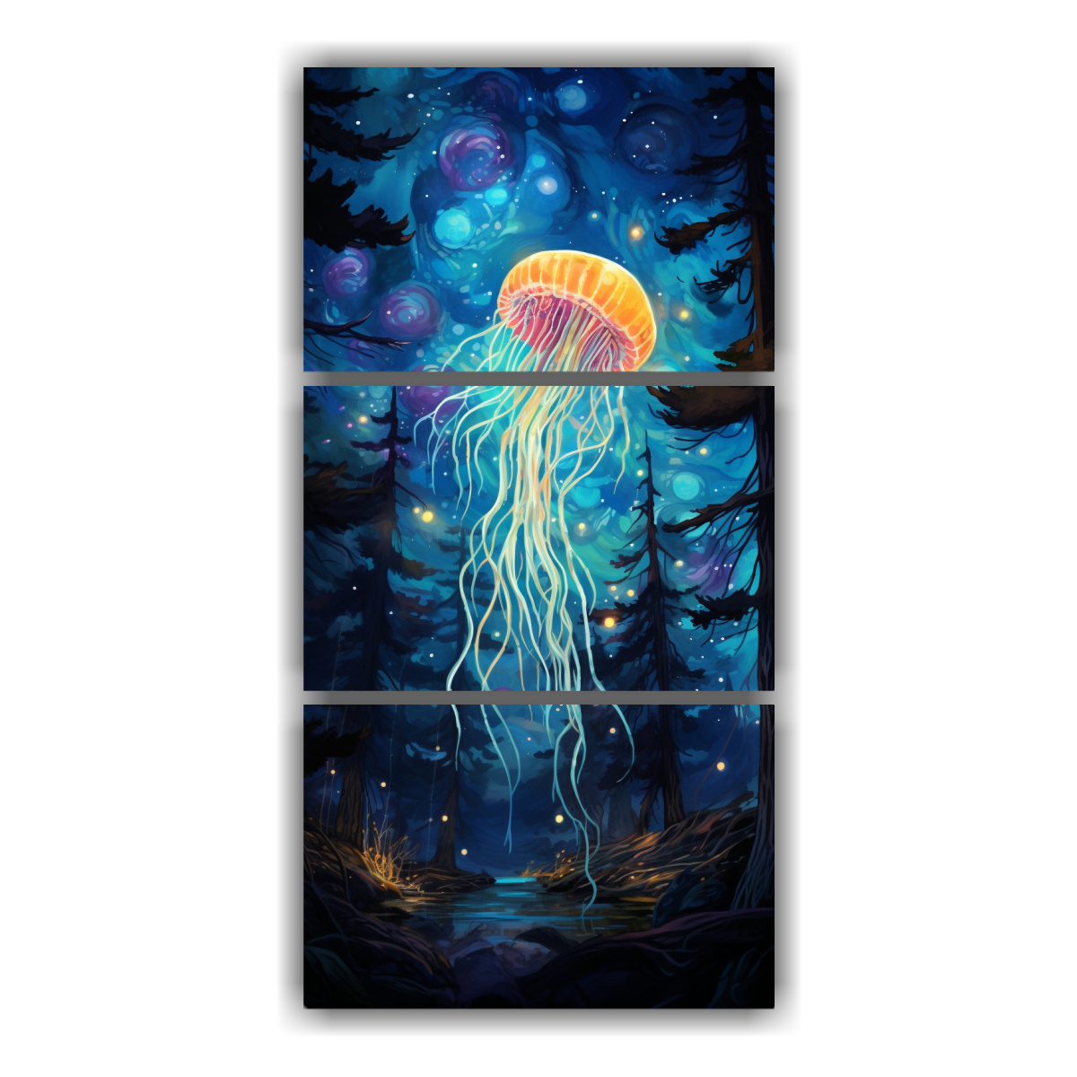Descubre nuestras pinturas decorativas de Tres Composiciones Tema lineales de la noche estrellada pero con medusas, en colores negro, plateado, turquesa, verde azulado, azul marino grisaceo, coral y dorado Impresas en tela de alta calidad y con bastidores de madera