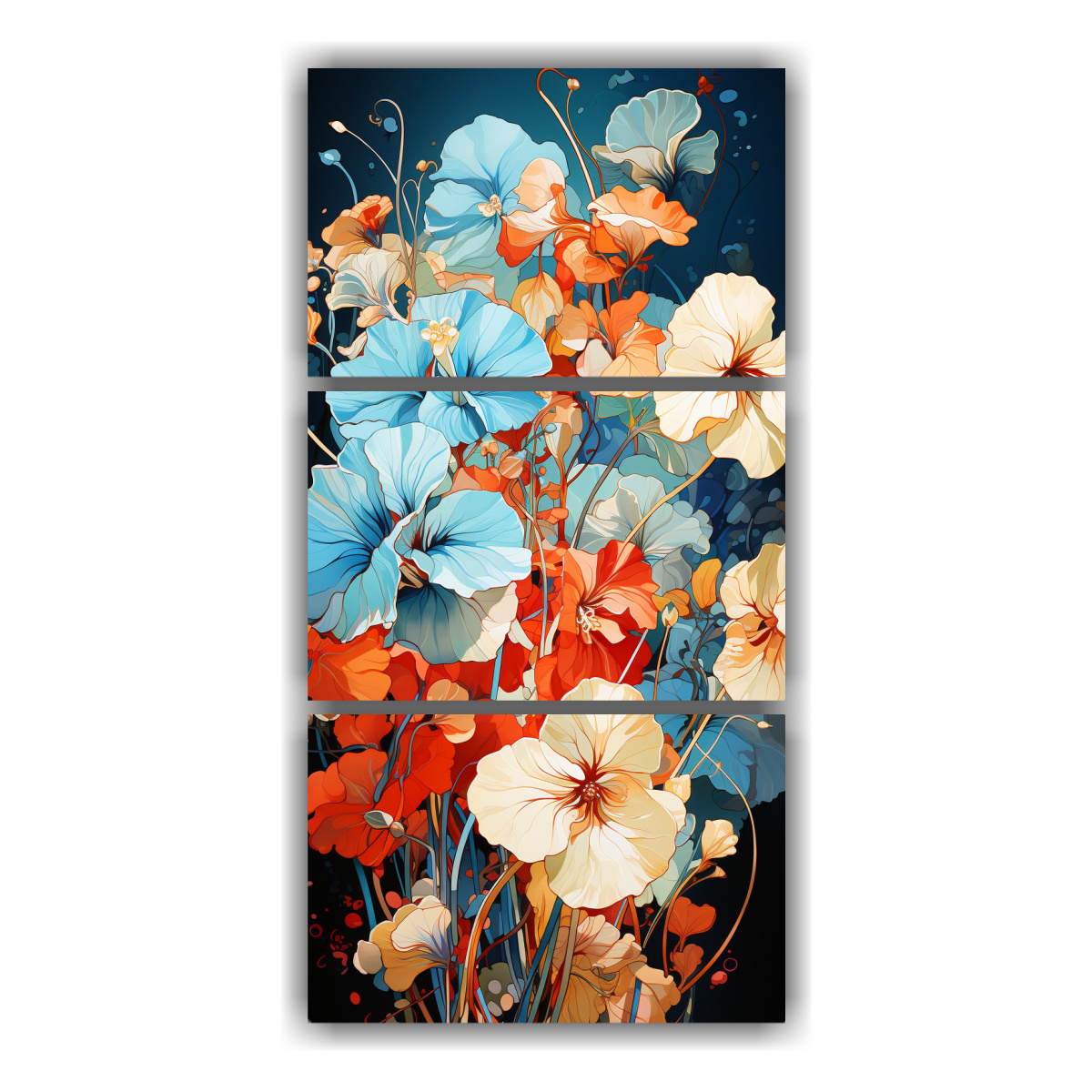 Pinturas Decorativas De Tres Cuadros Con Nasturtium En Rojo Y Azul, Atmósfera Neonoir.