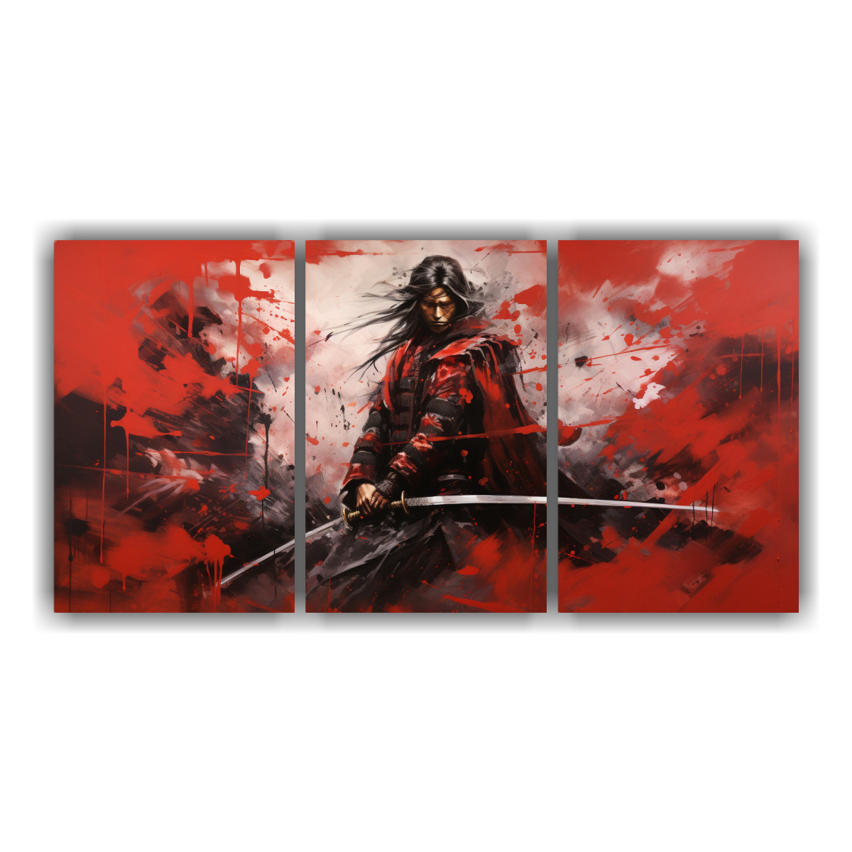 Pinturas Decorativas De Tríptico Tonos Composición Equilibrada De Retrato Abstracto Del Honor Y Coraje De Un Samurái.