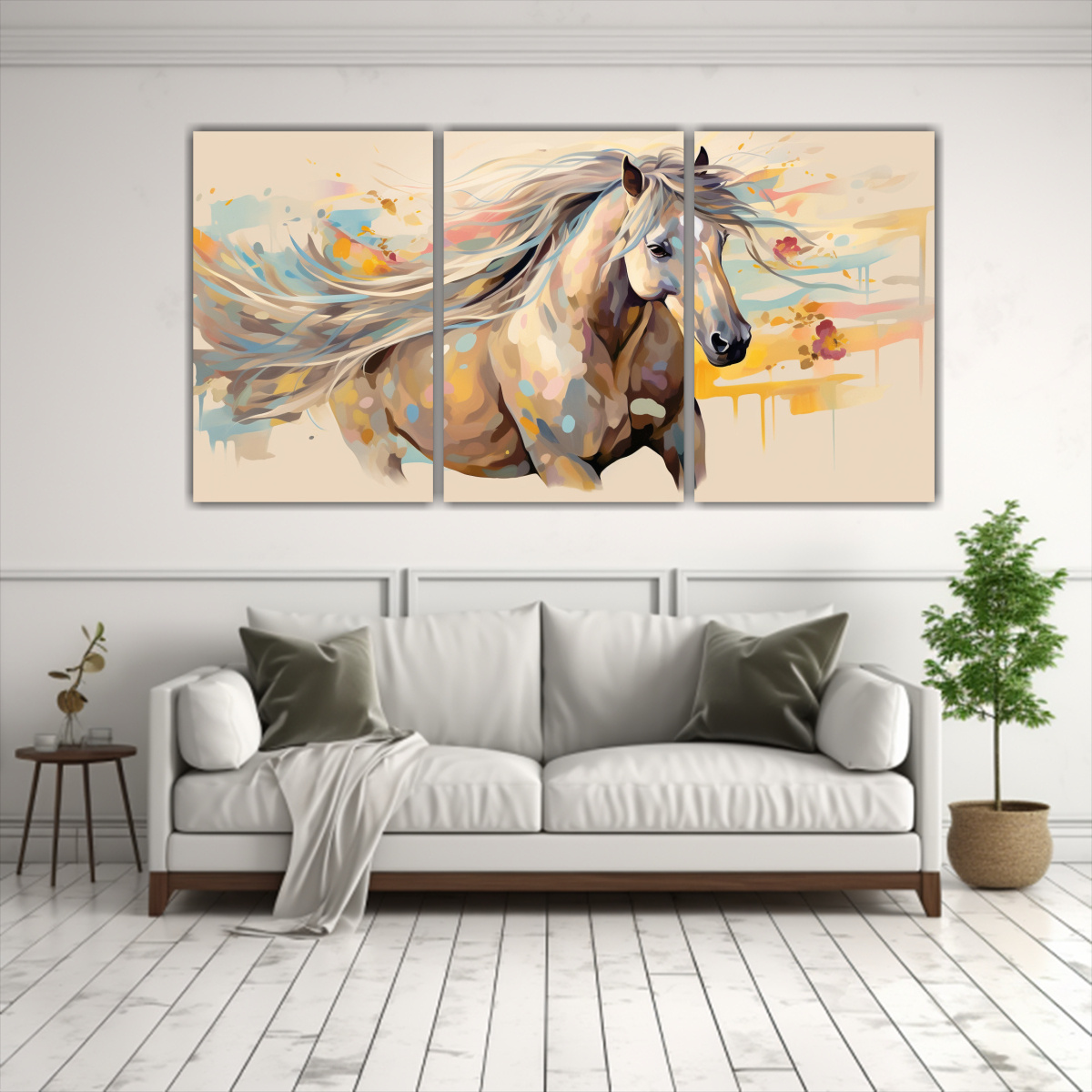 Renueva tu espacio con un toque de elegancia y estilo con nuestra pintura decorativa de un caballo andaluz en tonos pastel y dorados Con la mejor calidad del mercado, entregas rápidas y gratuitas en Santiago y envíos express a regiones Atrévete a decorar con arte exclusivo