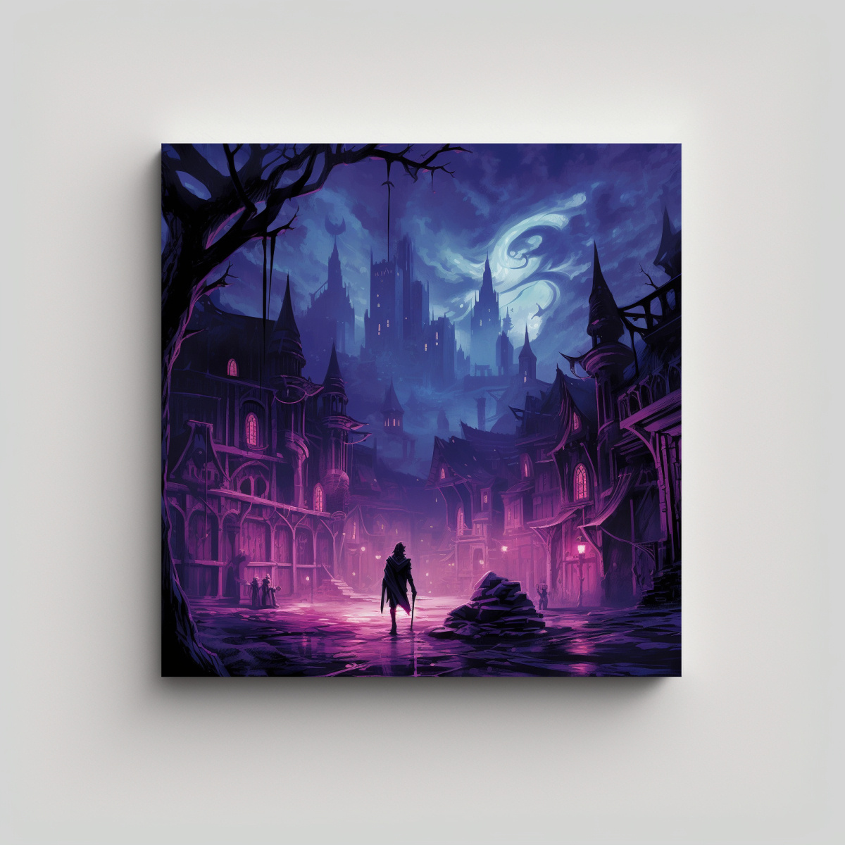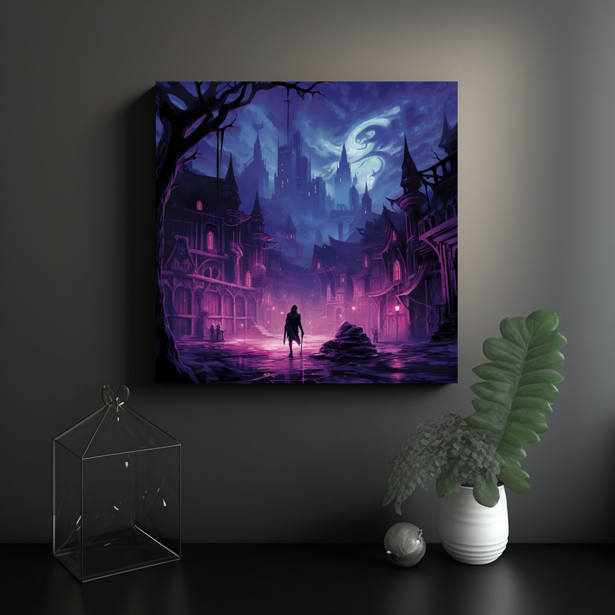 Este cuadro decorativo digital de la ciudad en tonos morados sería perfecto para darle un toque urbano y moderno a tu sala de estar Colócalo sobre un mueble blanco para resaltar los colores o en una pared gris para un contraste elegante ¡Atrévete a decorar con estilo y personalidad!