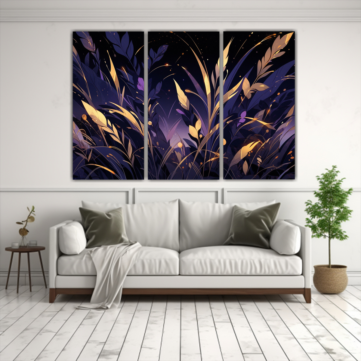 Este set de cuadros dinámicos en púrpura y dorado se vería espectacular en un salón moderno o en un dormitorio elegante Combínalos con muebles en tonos neutros para resaltar su impactante diseño neonoir ¡Cautiva miradas con esta pieza única en tu hogar!