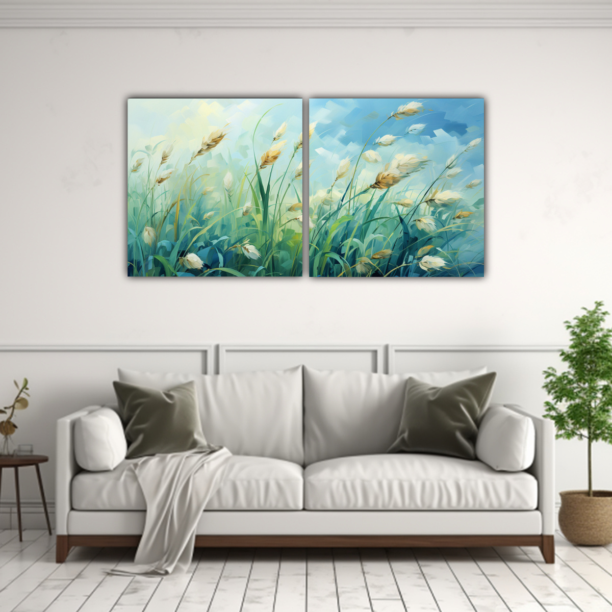 Este cuadro Diptico Modernos Composición dinámica A Oats Grains en colores verde y azul con atmósfera neonoir quedará perfecto en tu sala de estar Combínalo con muebles de tonos neutros como gris o beige para resaltar su belleza También puedes colocarlo en tu dormitorio para crear un ambiente relajante y moderno ¡Atrévete a decorar con estilo!