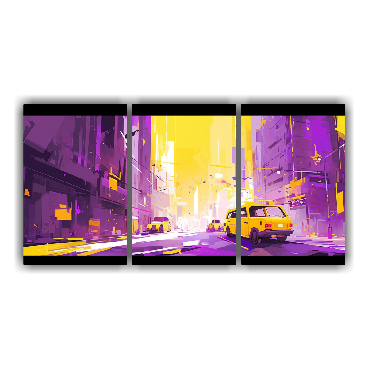 Este juego de tres cuadros en amarillo y morado es ideal para decorar un dormitorio o sala de estar contemporánea Colócalos juntos en una pared blanca para resaltar su vibrante combinación de colores