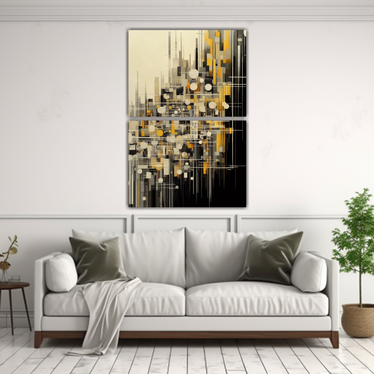 Este cuadro en armonía de colores, con tonos plateados, negros, azul marino grisáceo, grises y mostaza, se vería perfecto en una sala de estar moderna Colócalo sobre un sofá de color neutro para resaltar su impactante diseño También puedes combinarlo con cojines y cortinas en tonos similares para crear un ambiente equilibrado y sofisticado