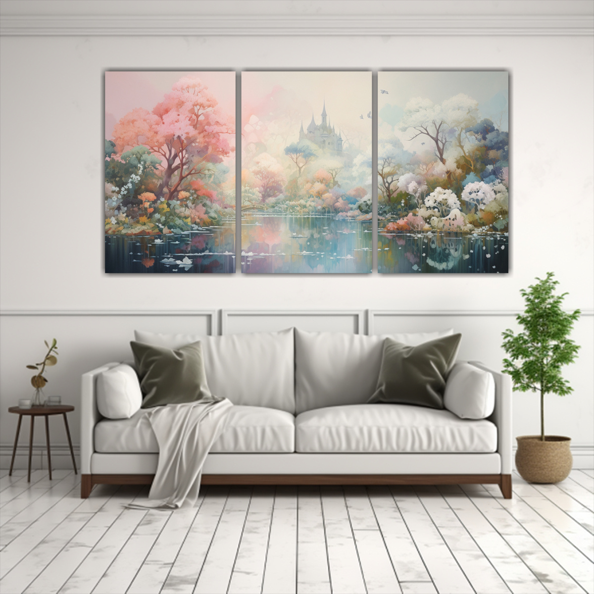Pinturas Decorativas En Bastidor Con Movimiento De Tres Telas De Madera En Escenario De Jardín Tranquilo.
