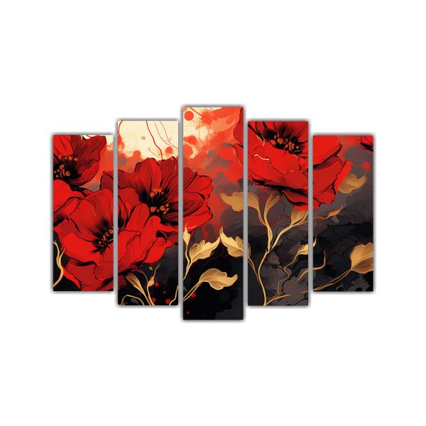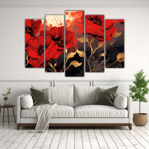 Este set de 5 telas en bastidor con tonos rojo y dorado en estilo neonoir sería ideal para decorar tu sala de estar Puedes colocarlos juntos en una pared principal para crear un impacto visual o distribuirlos por la habitación para darle un toque de elegancia y misterio Combínalos con muebles en tonos neutros para resaltar su belleza