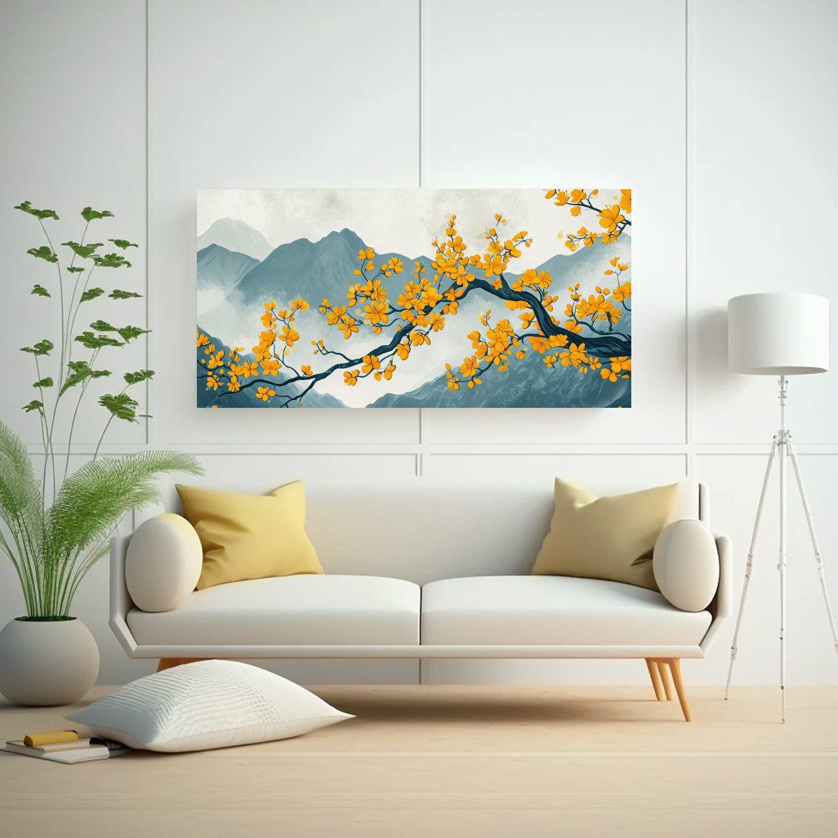 Pinturas Decorativas En Bastidor: Esquema Amarillo De Flores Albaricoque, Montaña Y Nube.