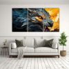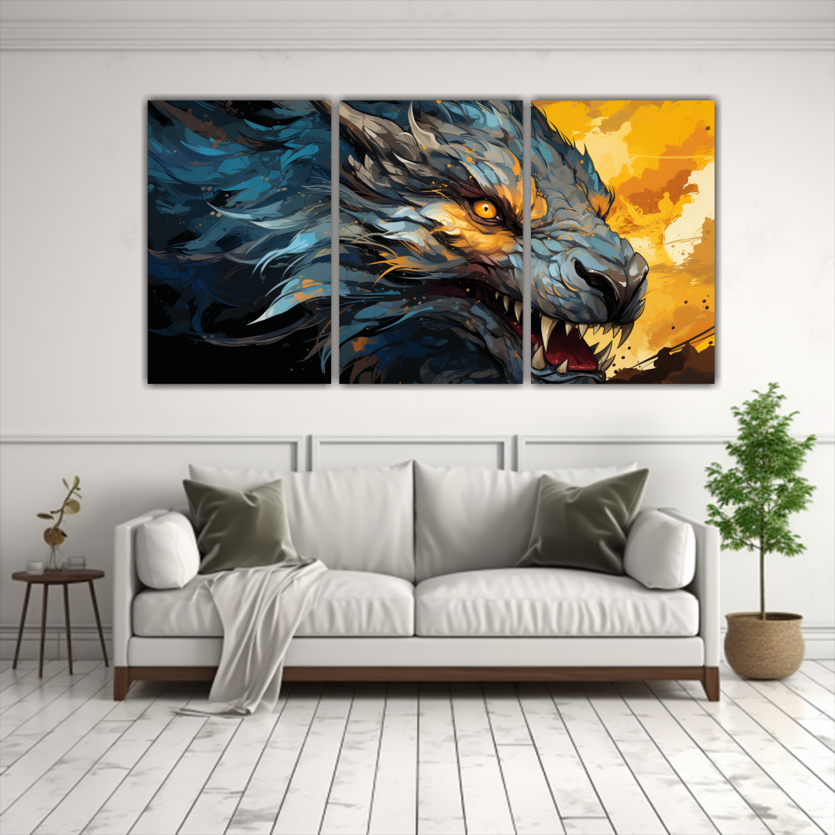 Pinturas Decorativas En Bastidor Moderno Con Tres Telas De Dragón En Amarillo Y Azul, Ambiente Neonoir.