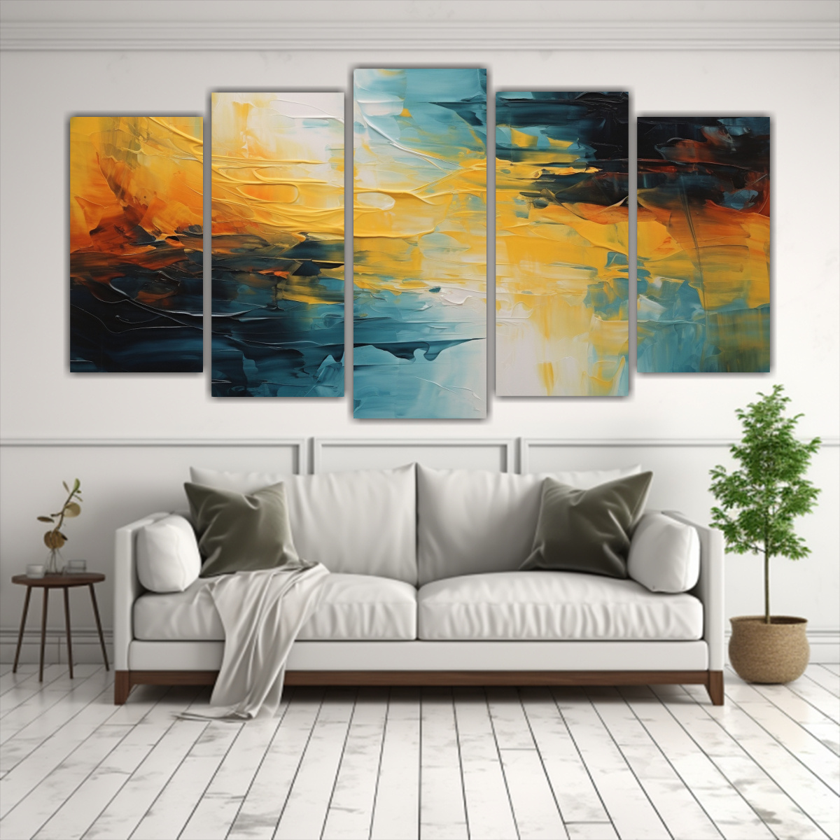 Este cuadro abstracto duradero de Cinco Cuadros Conceptual es perfecto para decorar tu sala de estar o dormitorio Combina los colores coral, plateado, azul marino grisaceo, gris, turquesa, verde azulado y carmesí para crear un ambiente moderno y elegante Colócalo sobre un sofá gris claro para resaltar los tonos azules y verdes, o sobre una pared blanca para un contraste llamativo ¡Aprovecha nuestra calidad superior y precios económicos para llevar este diseño exclusivo a tu hogar!