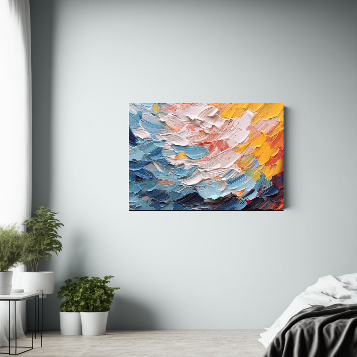 Coloca este cuadro en el salón principal de tu hogar, justo sobre el sofá para crear un punto focal impactante Combina los tonos del cuadro con cojines en tonos neutros y detalles en plateado para lograr un ambiente sofisticado y armonioso