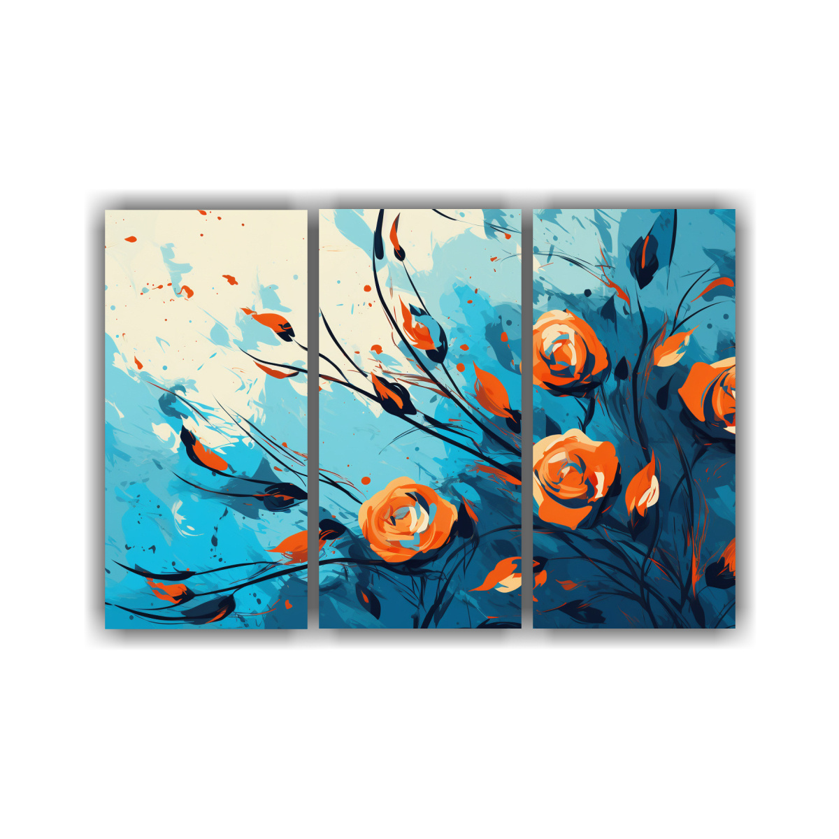 Este set de 3 cuadros en tonos naranja y azul con atmósfera neonoir es ideal para decorar un salón moderno Colócalos juntos en una pared principal para crear un impacto visual o distribúyelos en diferentes espacios para unificar la decoración de tu hogar