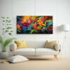 Este cuadro de arte en tela sublimada con patrones abstractos y vibrantes en un remolino es perfecto para decorar tu sala de estar Colócalo sobre un sofá de color neutro para que resalte y combine con los colores del cuadro También puedes complementar la decoración con cojines en tonos similares ¡Agrega un toque de color y estilo a tu espacio con este cuadro de DecoCuadros!