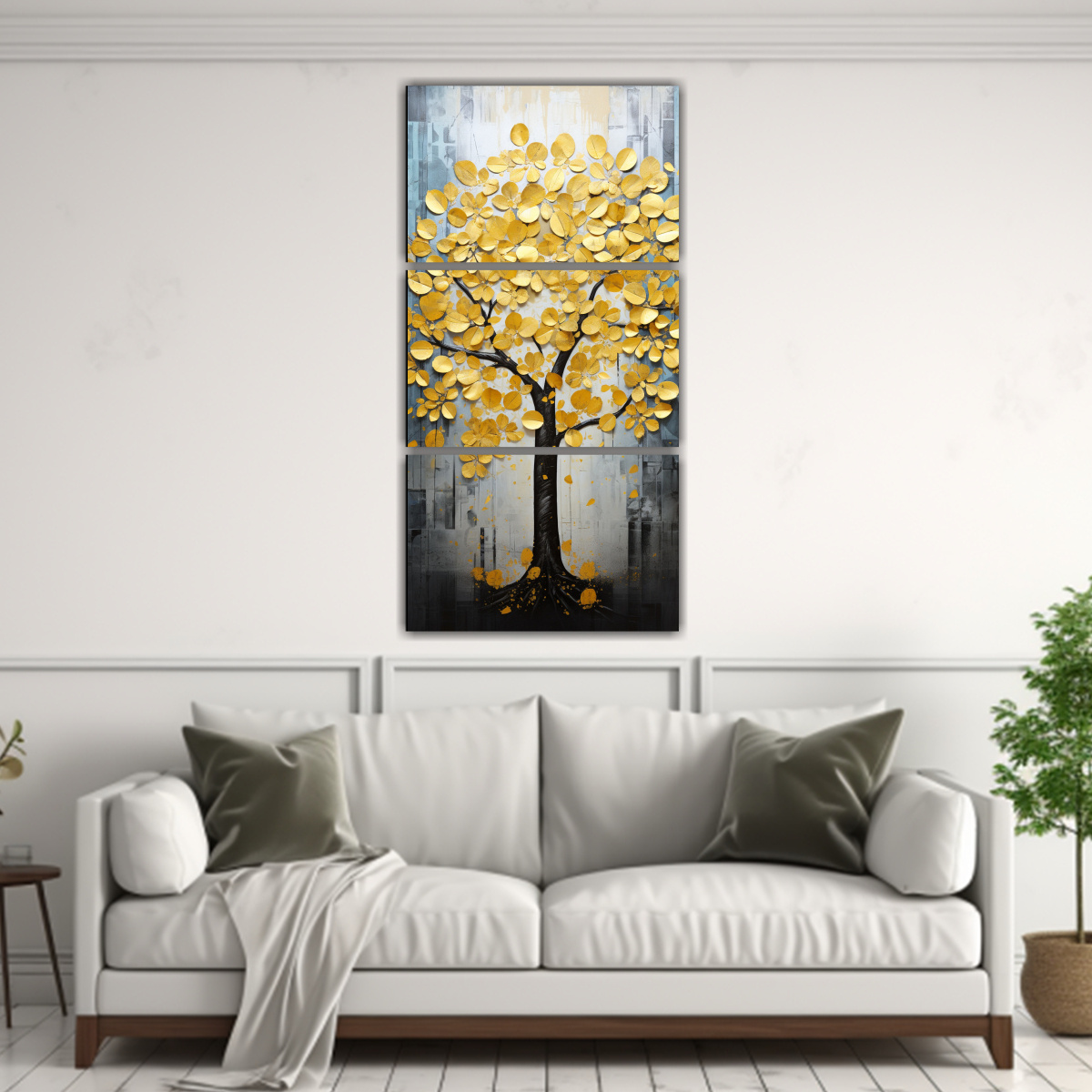 Pinturas Decorativas En Tonos Dorados Y Amarillos De Un árbol En El Escenario En Tres Composiciones