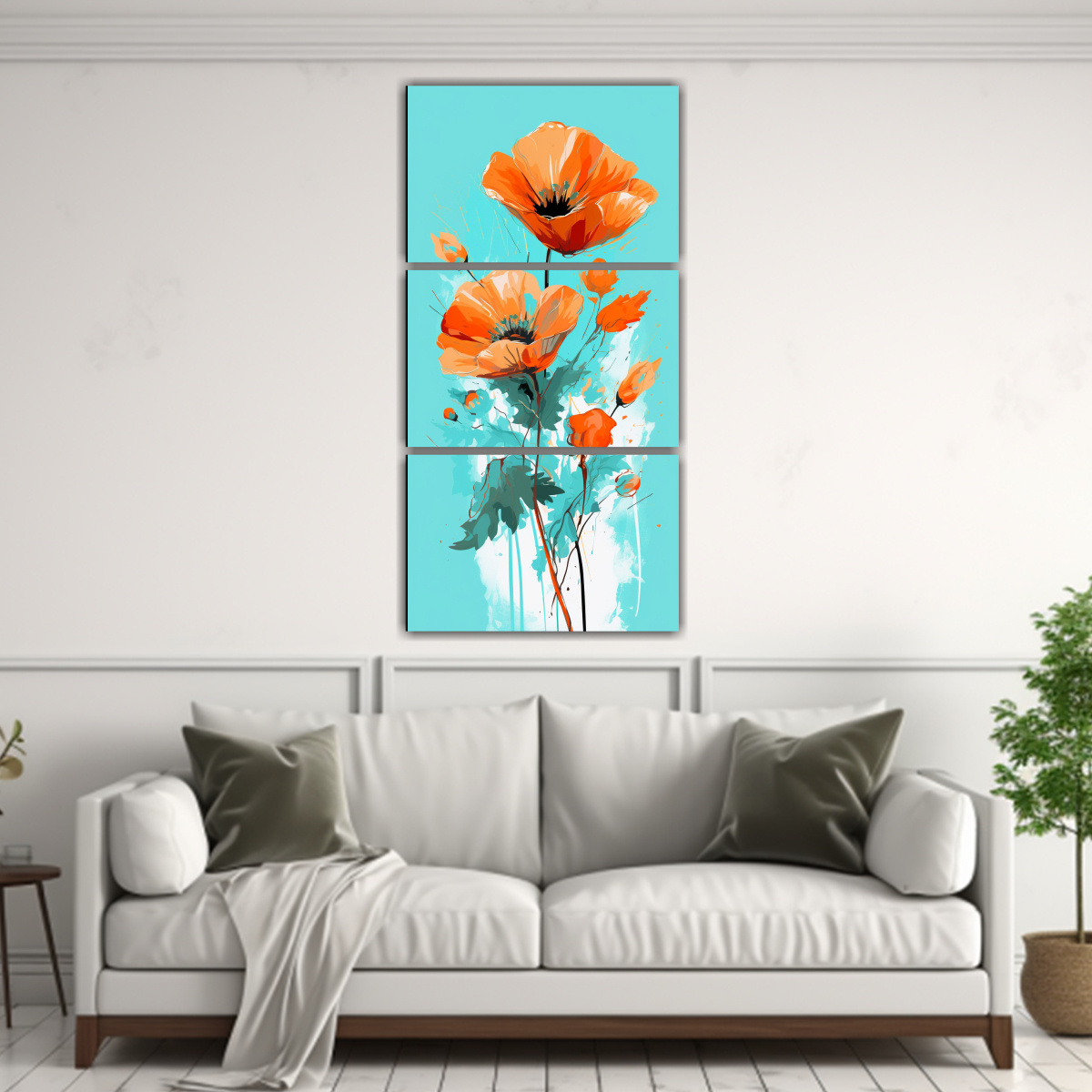 Para realzar la belleza de este cuadro, te recomiendo colocarlo en una pared blanca para que los colores turquesa y naranja resalten Combínalo con muebles en tonos neutros como beige o gris, y añade cojines en tonos menta o coral para lograr un ambiente armonioso y moderno