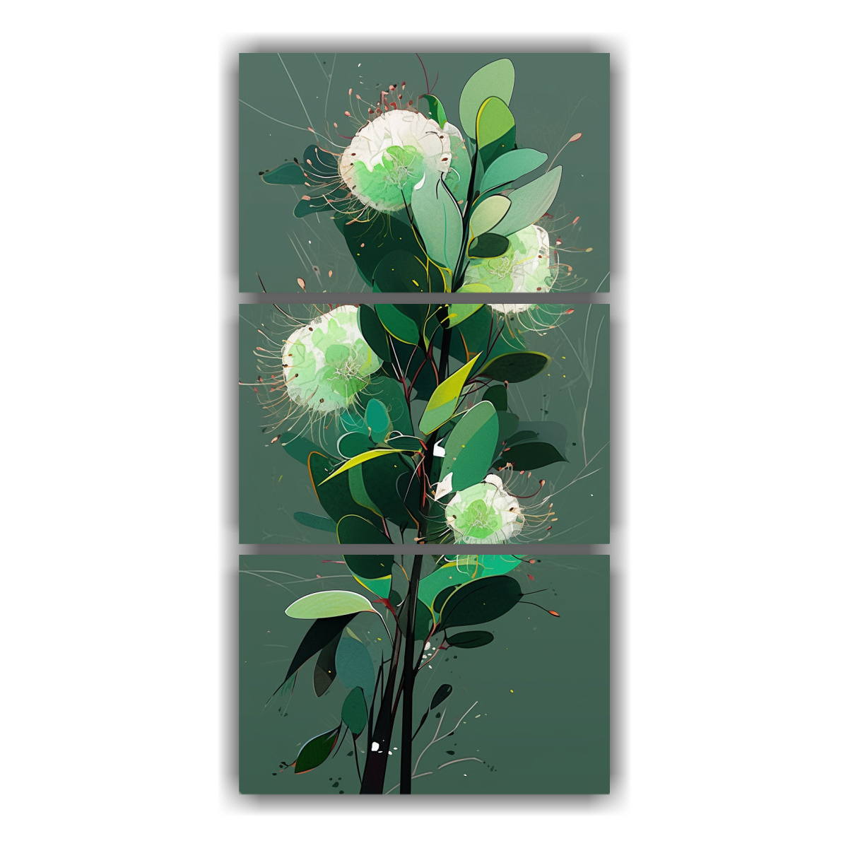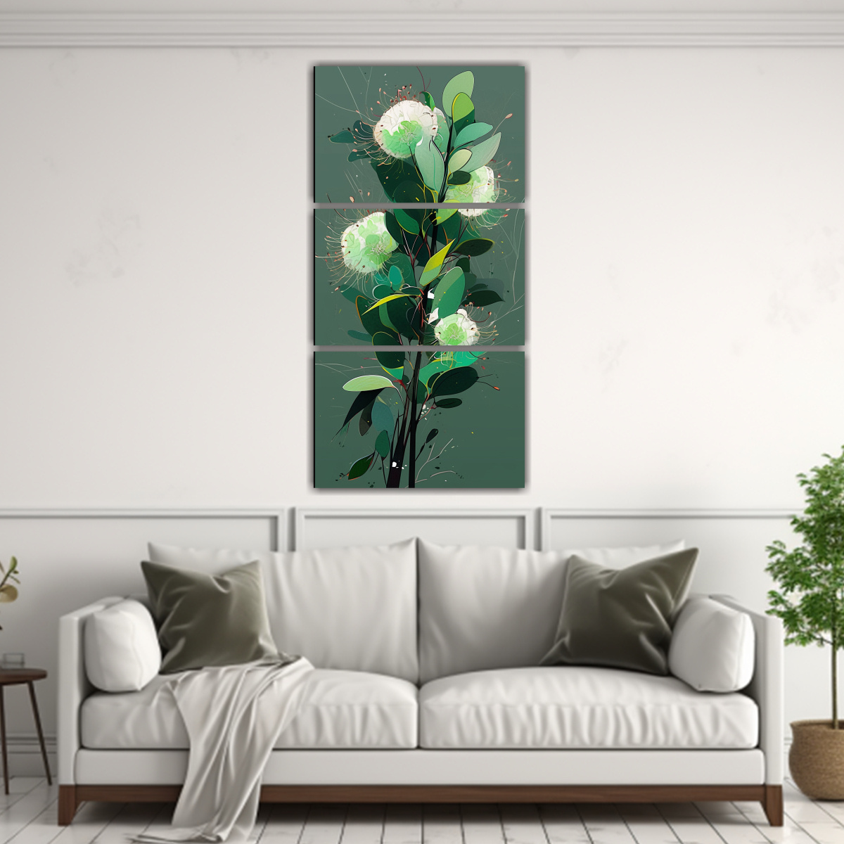 Este set de 3 cuadros decorativos en verde con elementos de eucalipto neo-noir sería ideal para colocar en la sala de estar sobre un sofá gris, creando un contraste elegante y sofisticado Complementa con cojines en tonos plateados y almohadas en azul marino para una decoración armoniosa