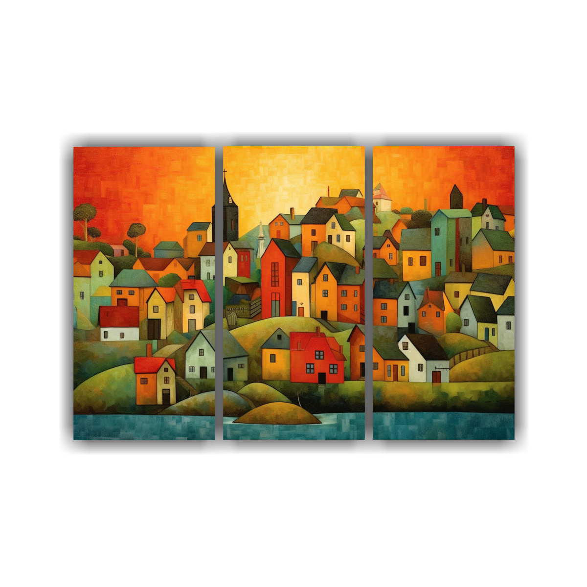 Este cuadro decorativo estilo europeo de colorido pueblo espectacular es perfecto para colocar en el salón principal de tu hogar Combínalo con muebles de estilo rústico o vintage para crear un ambiente acogedor y lleno de encanto ¡Atrévete a darle un toque único a tu espacio con esta obra de arte única!