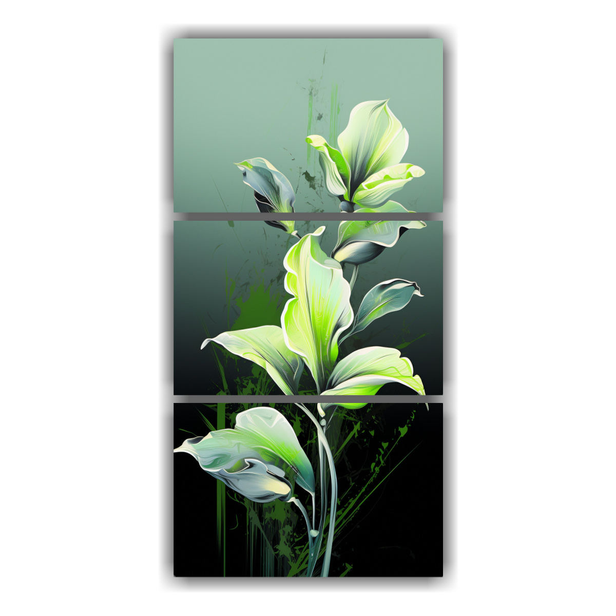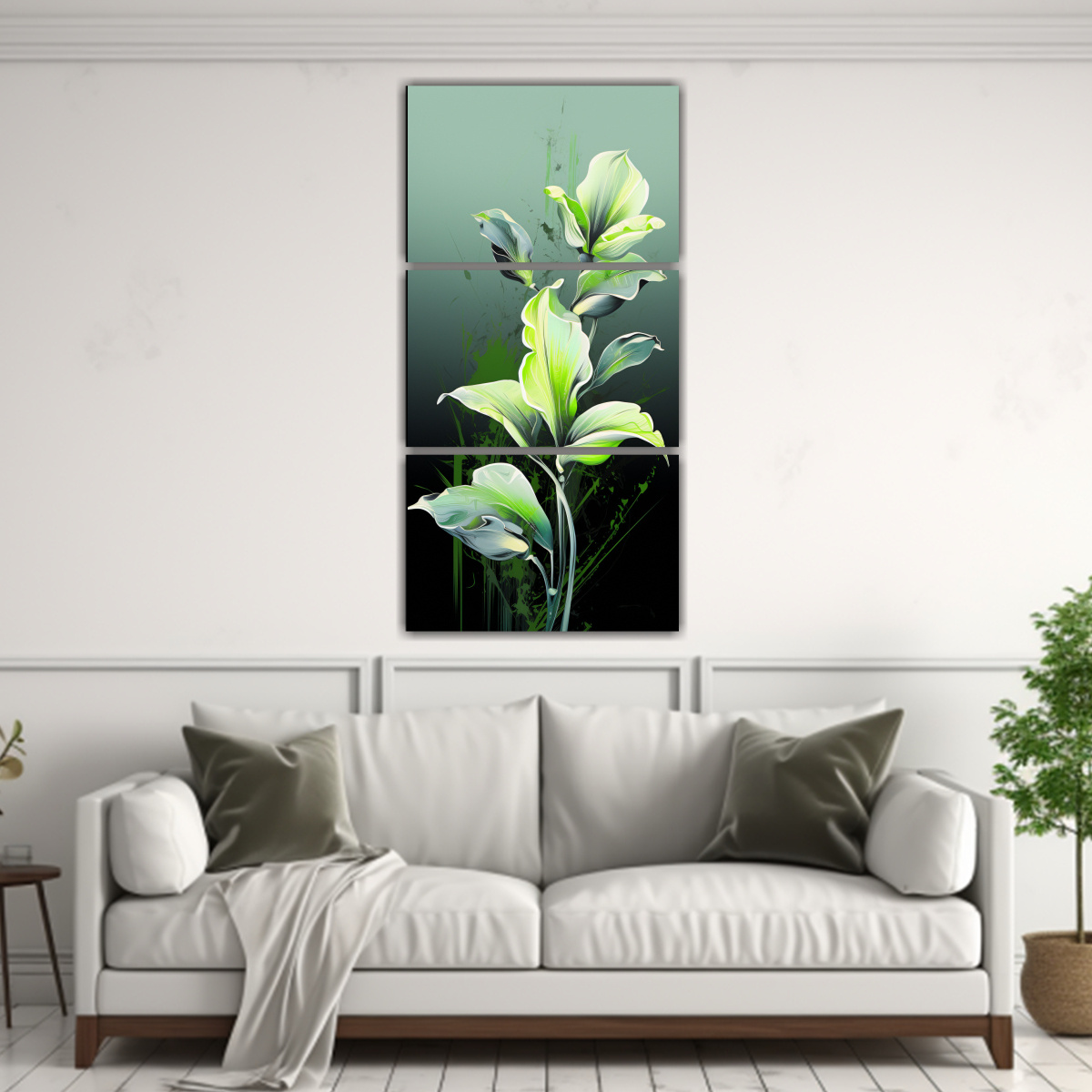 Para realzar la elegancia de tu sala de estar, coloca este set de 3 telas en bastidor en un muro color gris claro Combínalo con muebles en tonos neutros y complementa con cojines en amarillo mostaza para un ambiente sofisticado y moderno