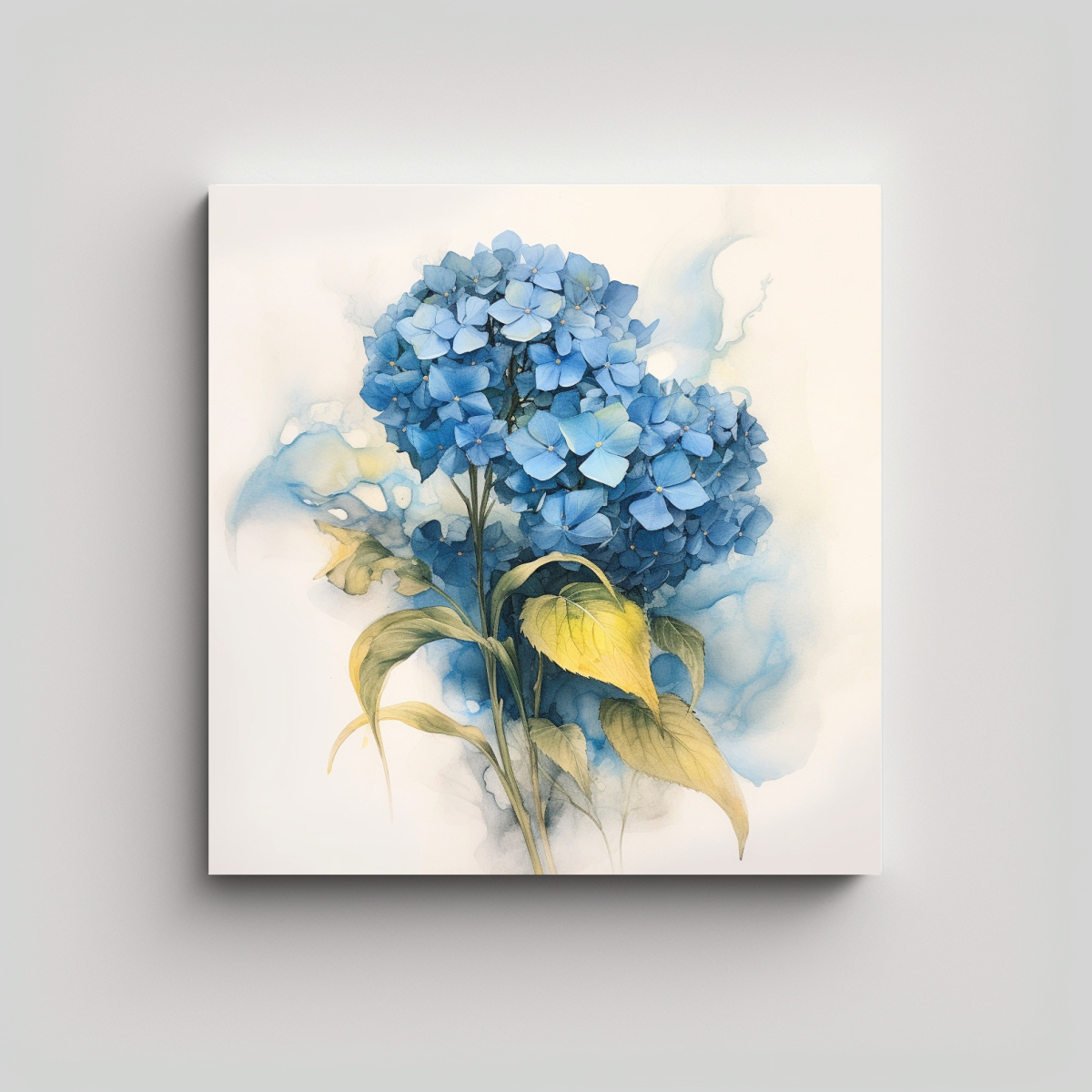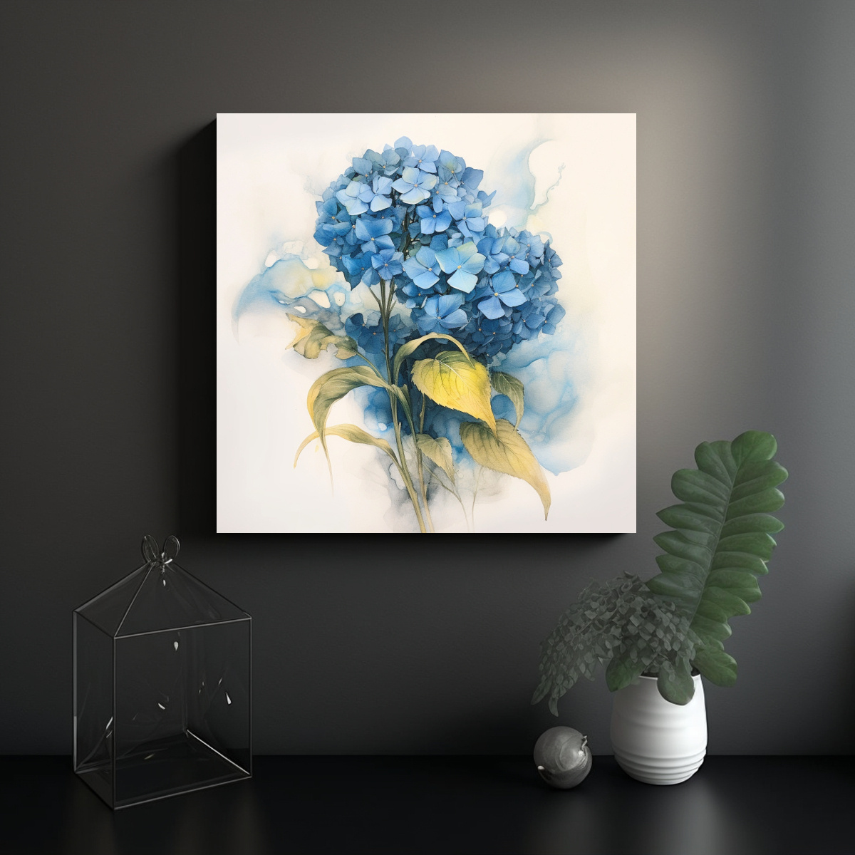 Pinturas Decorativas: Hortensias Azules En Humo, Estilo Gongbi Chino Con Toques Amarillos
