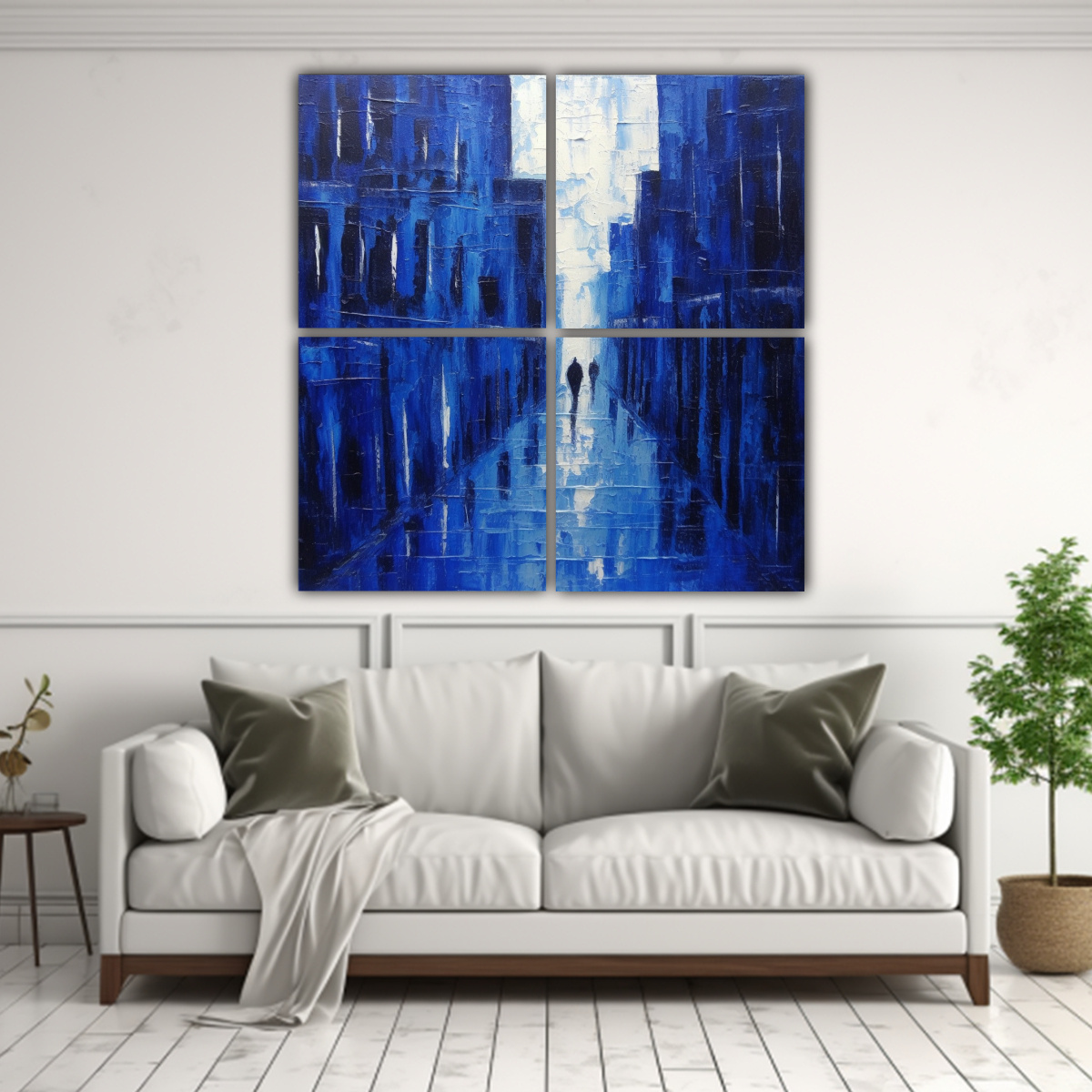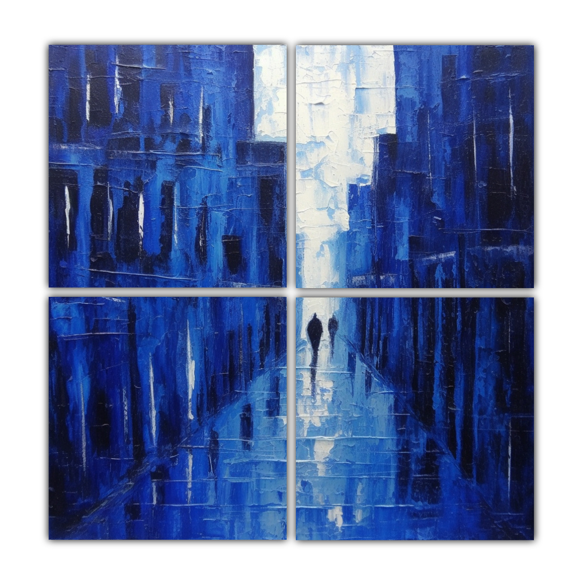 Pinturas Decorativas Innovadoras En Bastidor: Composición De 4 Telas En Azul Lluvia, Calles Pacíficas Sin Gente