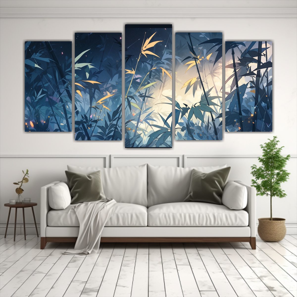 Pinturas Decorativas Juveniles En Lienzos De Tela Con Colores Acuarelados Y Atmósfera Neonoir En Plantas De Bambú En Agua