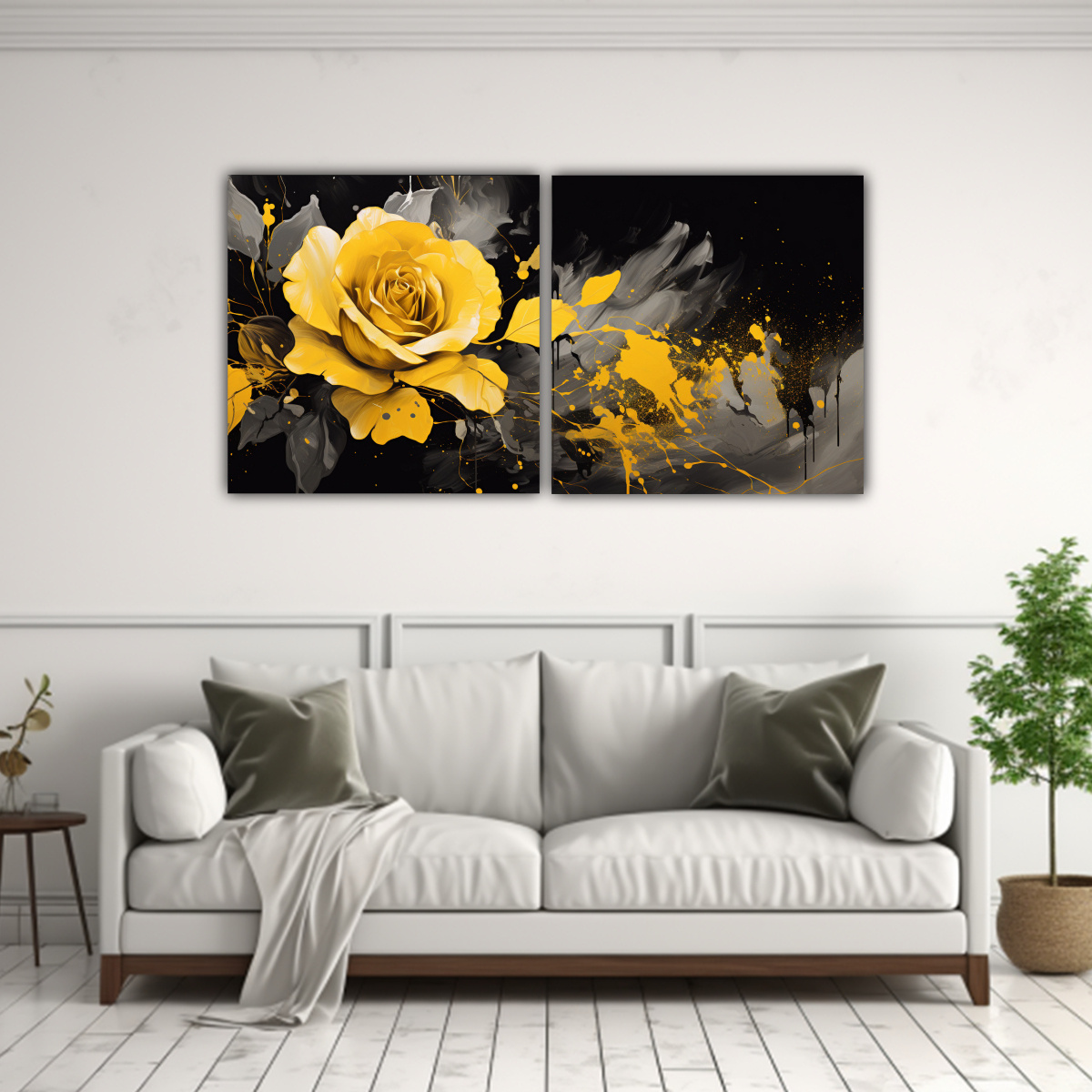 Pinturas Decorativas Lineales En Tonos Amarillo Y Dorado Con Atmósfera Neonoir Al Estilo De Dos Lienzos Creativa.