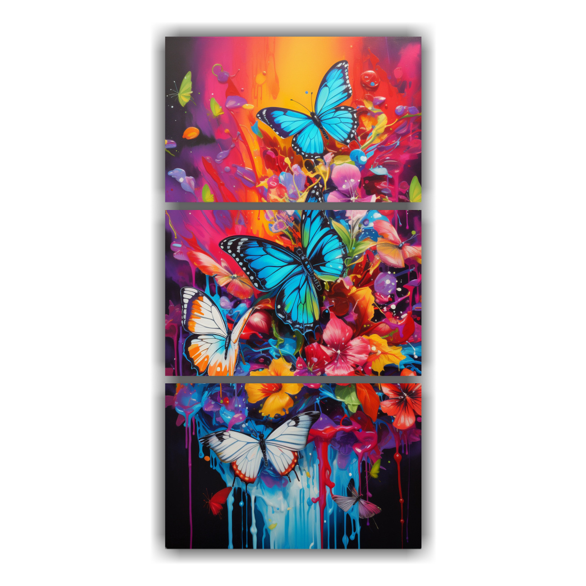 Explosión de alegría con esta composición abstracta que fusiona tres mariposas y flores en un estilo psicodélico y cartoon Aprovecha nuestra calidad premium a precios accesibles Decora tu hogar con arte exclusivo y entrega express a regiones