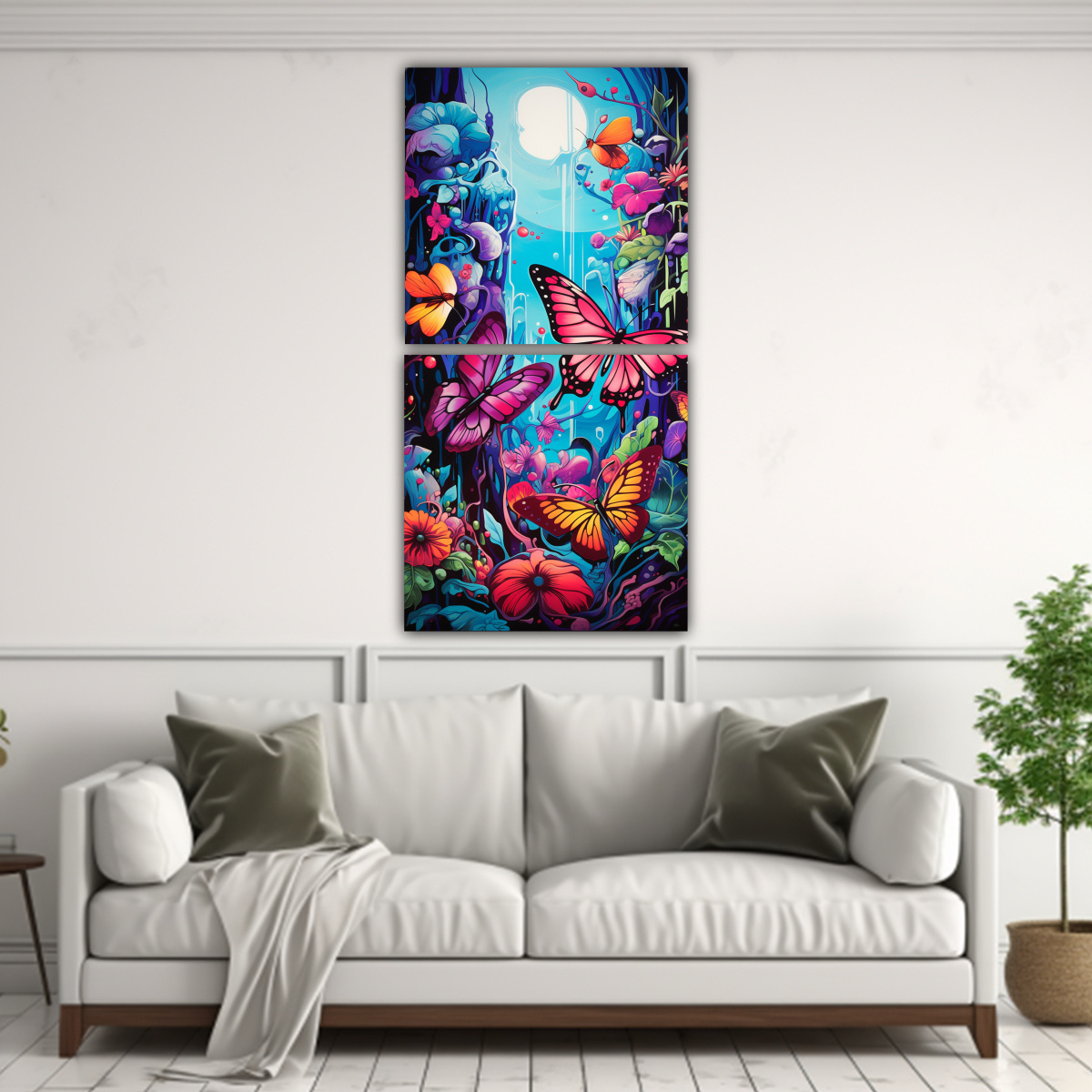 Este cuadro Minimalismo psicodélico de tres mariposas y flores en bastidor impreso es perfecto para agregar un toque de color y estilo a tu sala de estar o dormitorio Combínalo con muebles y accesorios en tonos neutros como blanco, beige o gris para resaltar su belleza También puedes colocarlo en una pared de acento o en una galería de arte personalizada para crear un ambiente único y sofisticado ¡Decora con estilo con DecoCuadros!