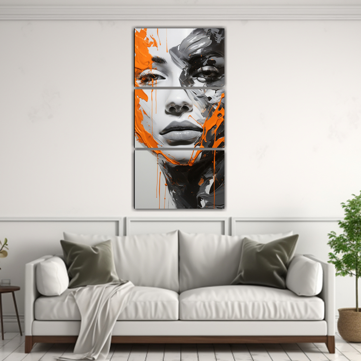 Pinturas Decorativas Modernas: Contornos Faciales Y Salpicaduras Plateadas Y Naranjas.