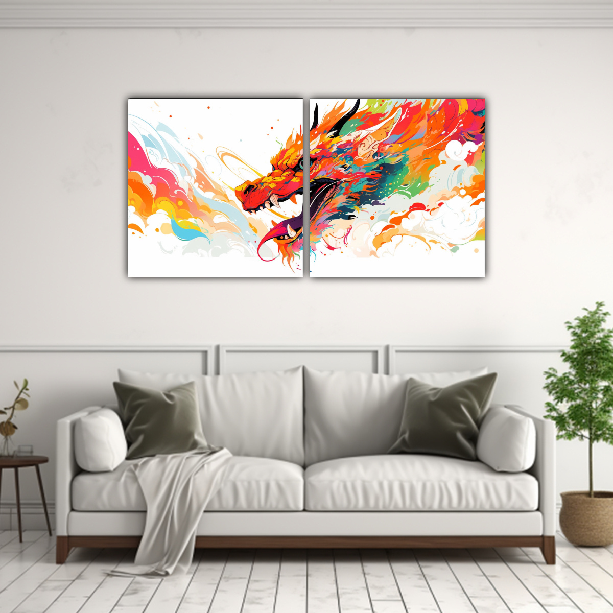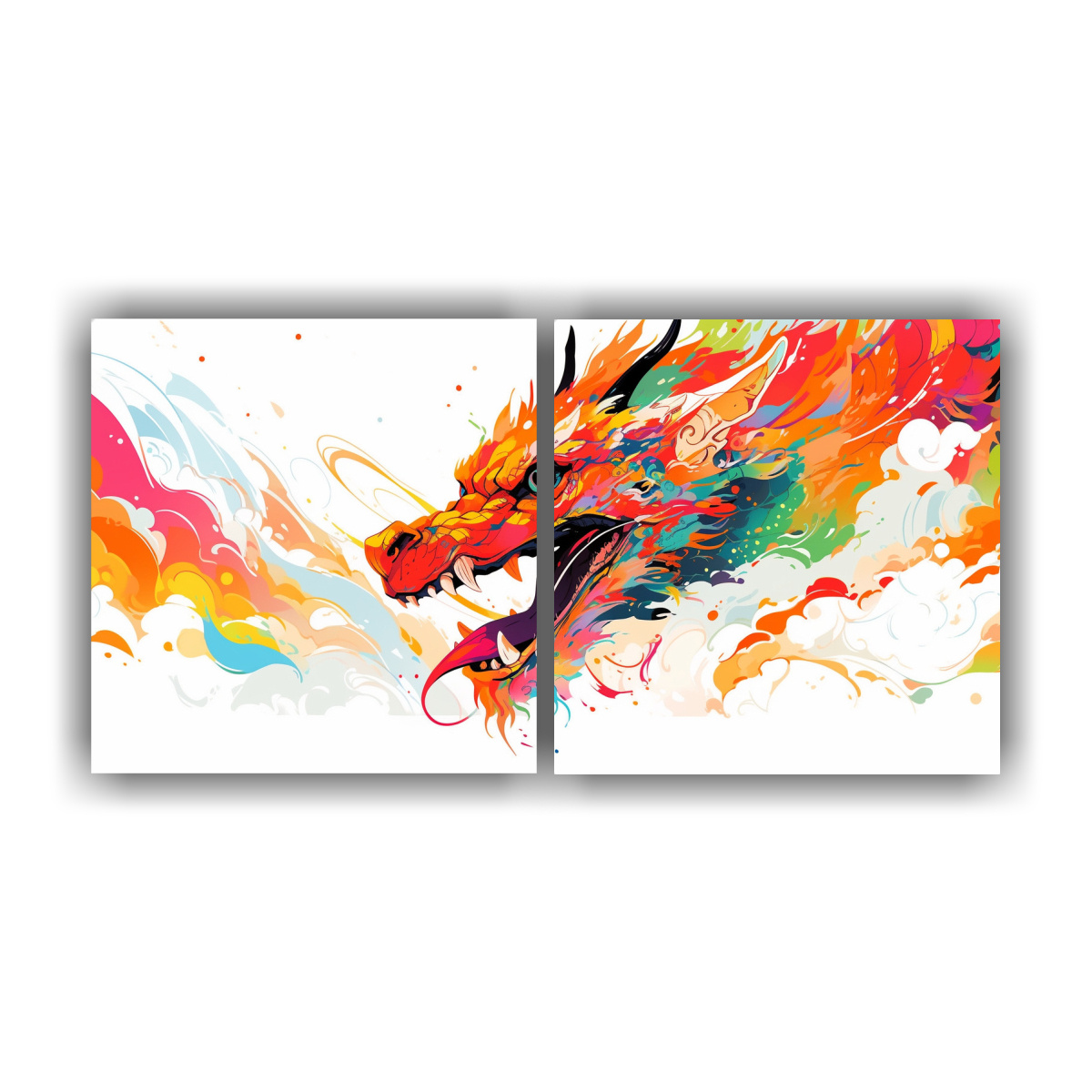 Pinturas Decorativas Modernas De Dragón En Colores Arcoíris Y Naranja Atmósfera Neonoir.